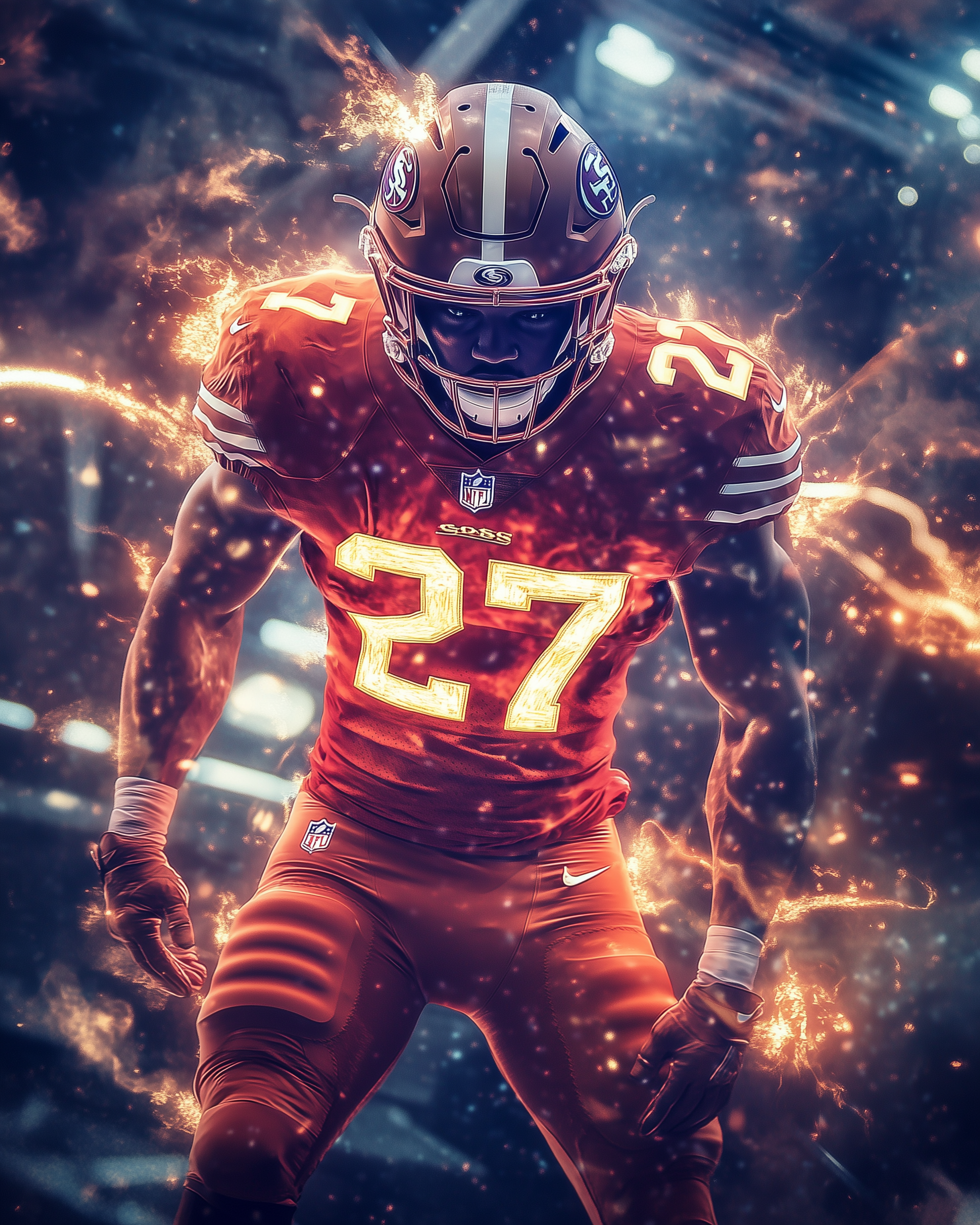 The image showcases a striking athlete clad in a reflective metallic golden jersey, exuding an aura of strength and energy. The vibrant colors and dynamic pose create a sense of movement and intensity in the scene.