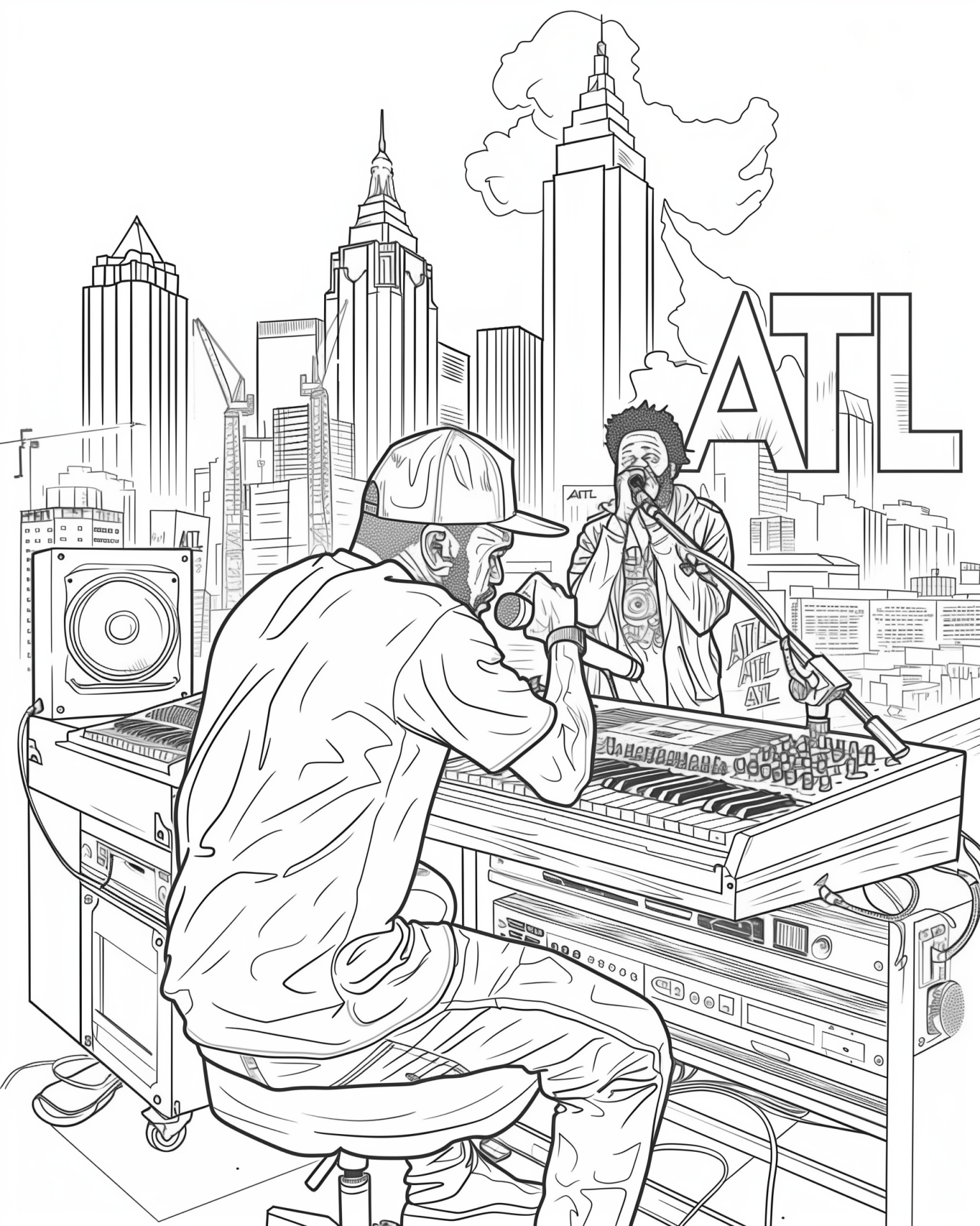 This illustration captures the vibrant energy of a contemporary trap music scene in Atlanta. Bright colors and dynamic lines showcase a producer working at a desk while a rapper passionately performs in the background.