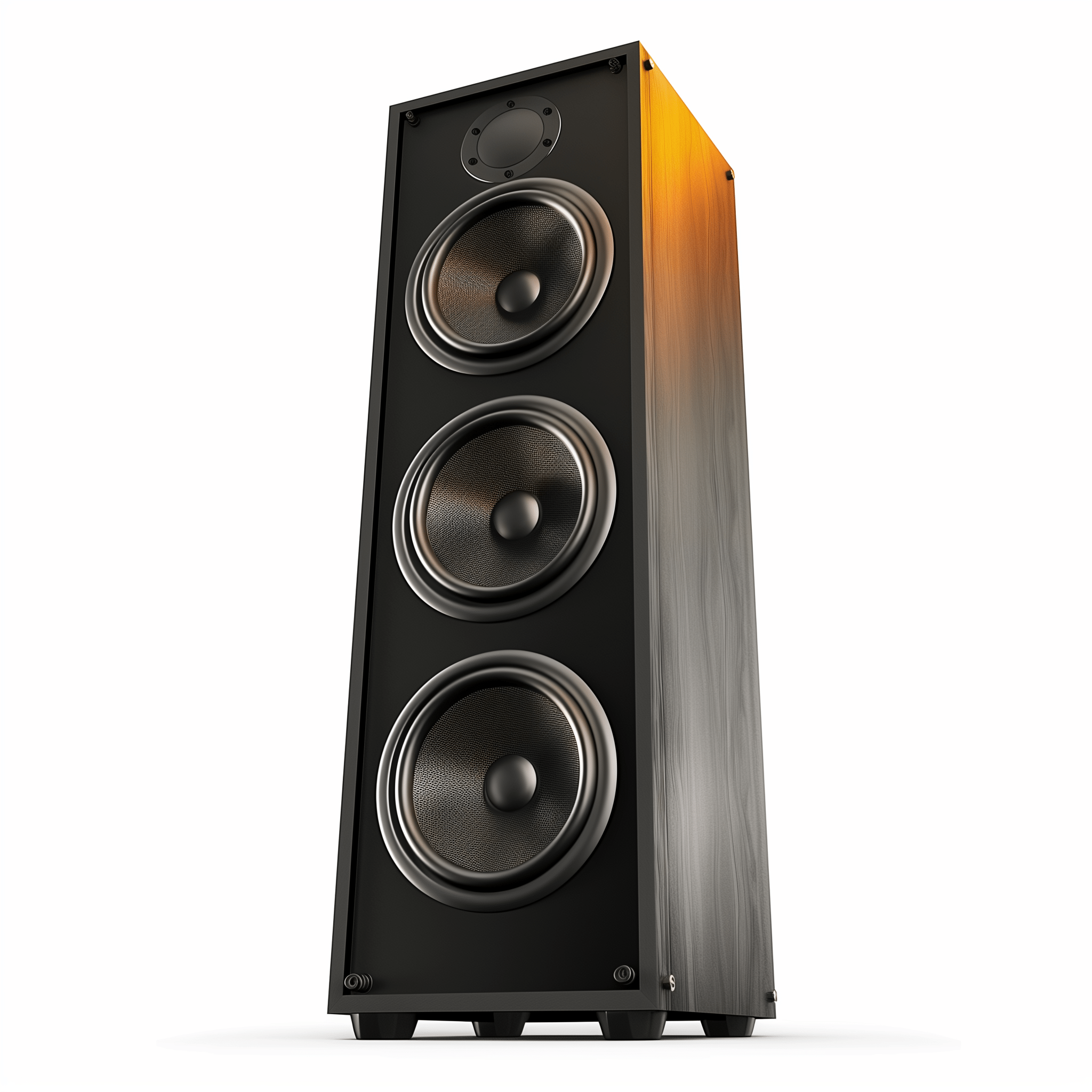 A high resolution image capturing a home theatre setup with stereo speakers. The focus is on the sleek design and modern aesthetic of the speaker system.