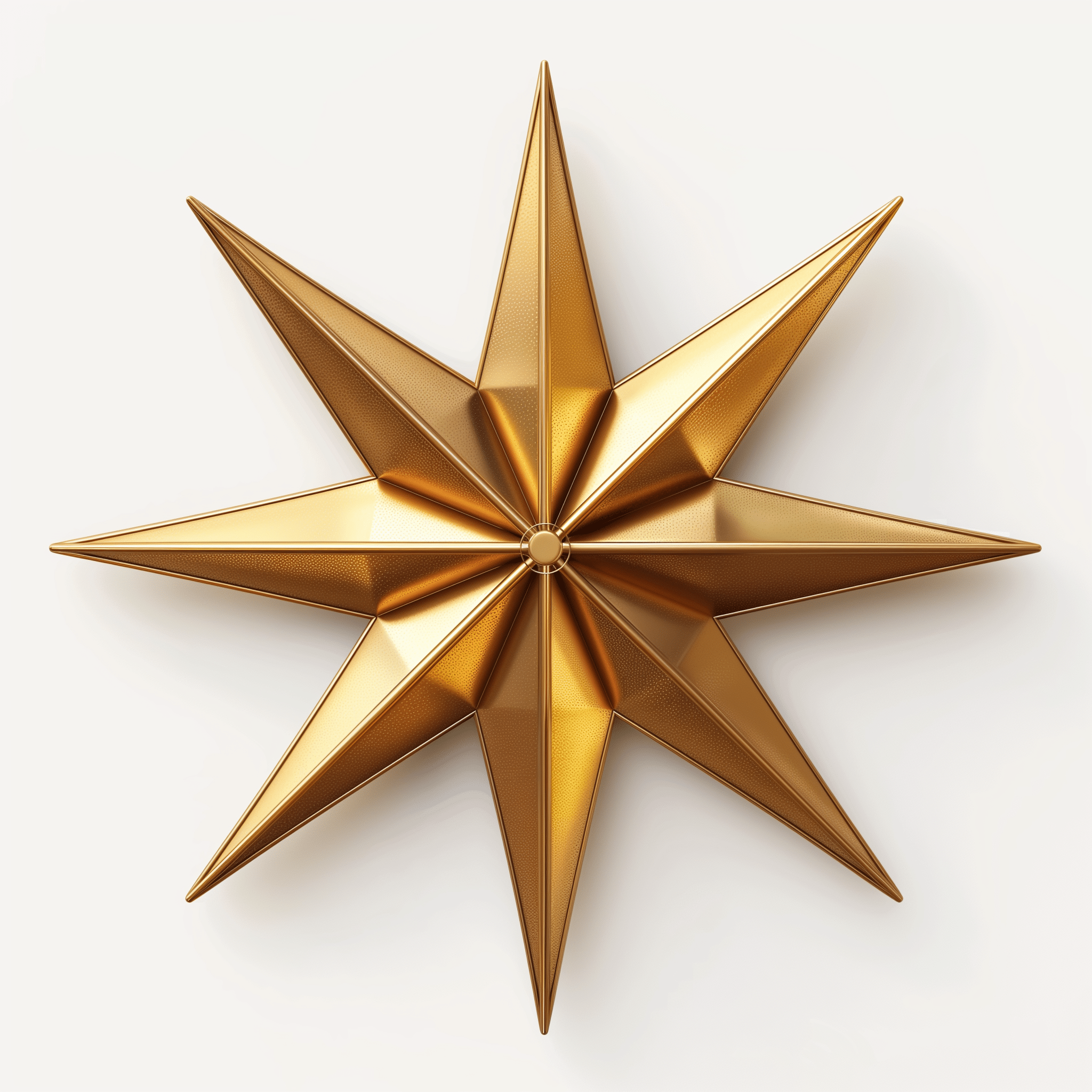 A majestic 3D golden star with sharp, pointed edges shining brightly on a clean white background.