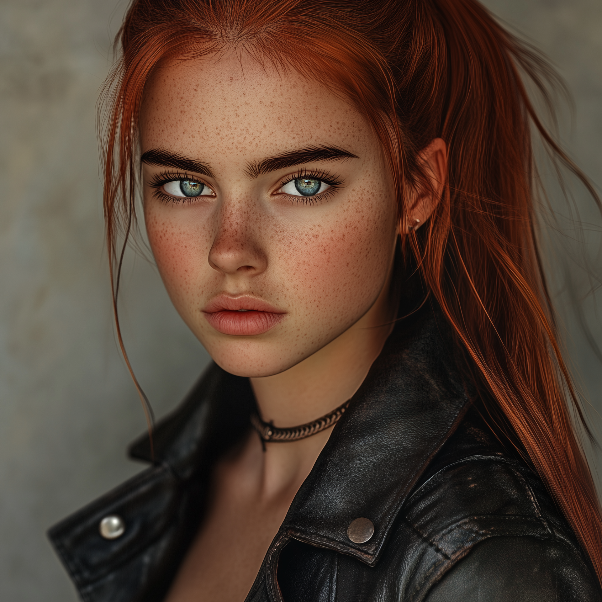 This photo realistic image features a young woman with a striking appearance, showcasing her vibrant red hair tied in a ponytail. She exudes confidence while dressed in a stylish leather jacket, set against a neutral background that enhances her features.