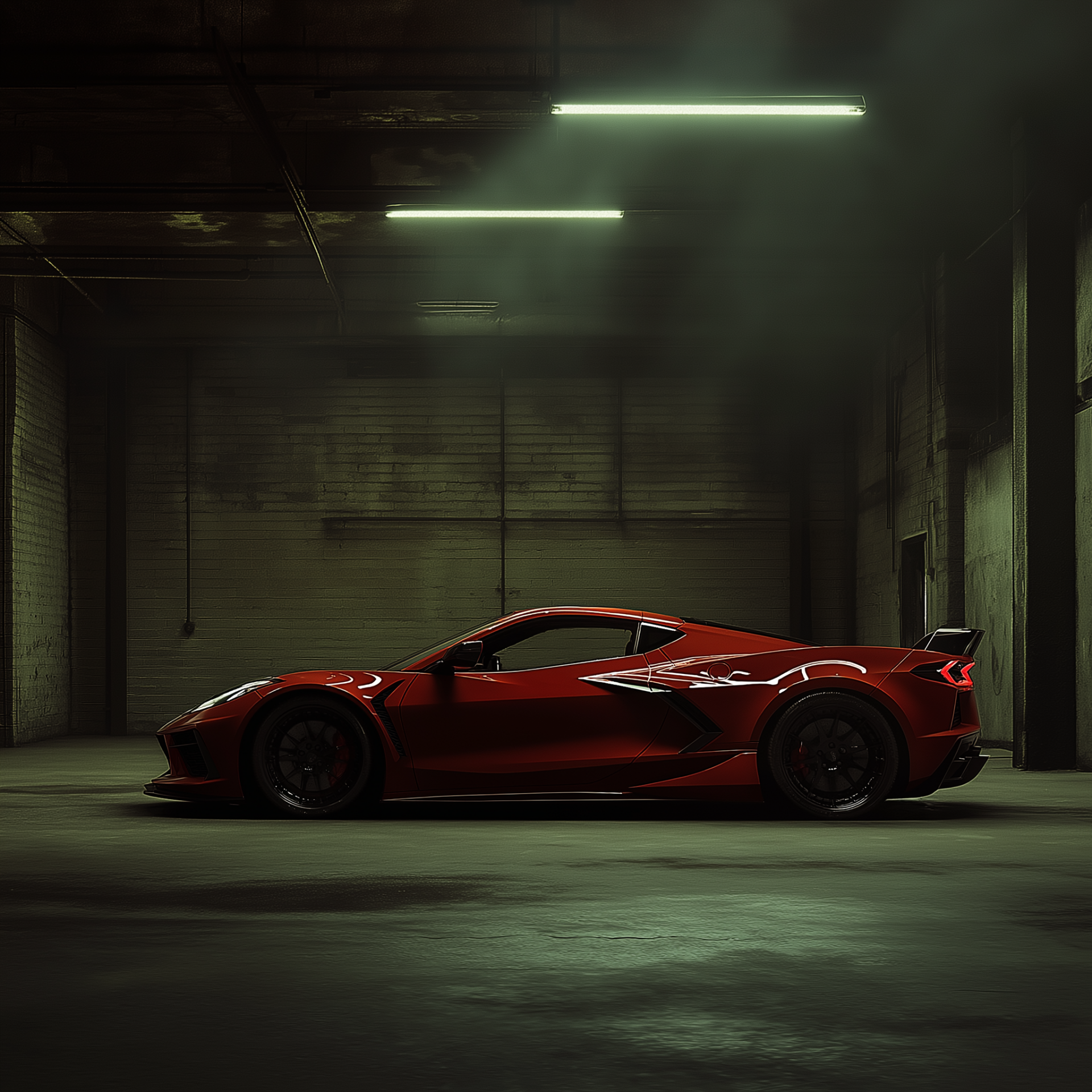 The image captures a striking red Chevrolet Corvette Z06 parked in a dimly lit private garage, highlighting its sleek contours. Dramatic lighting casts shadows that enhance the polished surface and smooth concrete floor, creating a photorealistic feel.