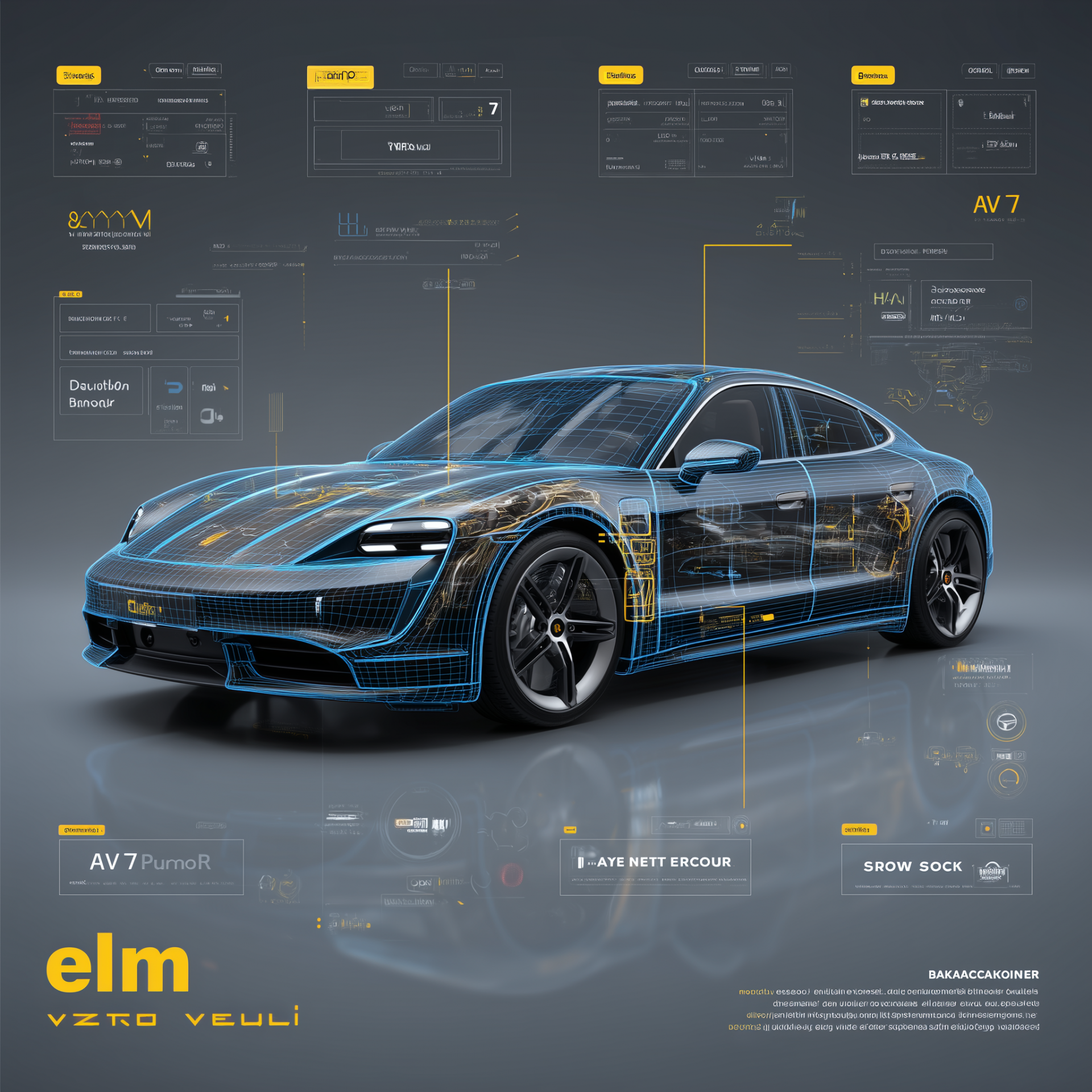 The image showcases a sleek digital interface with a dark gray background, emphasizing the vehicle systems displayed in blue and yellow lines. Various symbols and text add to the technical feel, creating a futuristic atmosphere around the central object.