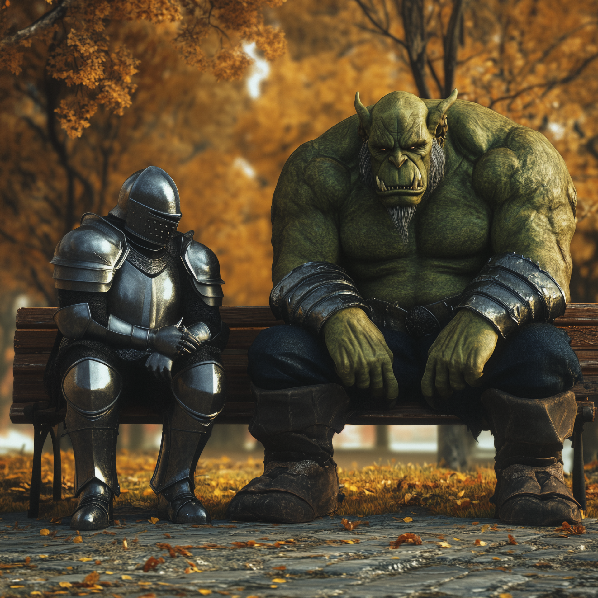 The image features a human knight standing in an autumnal setting, showcasing a striking 3D render with a clear design. The warm colors of the fallen leaves complement the knight's armor, creating a captivating contrast.