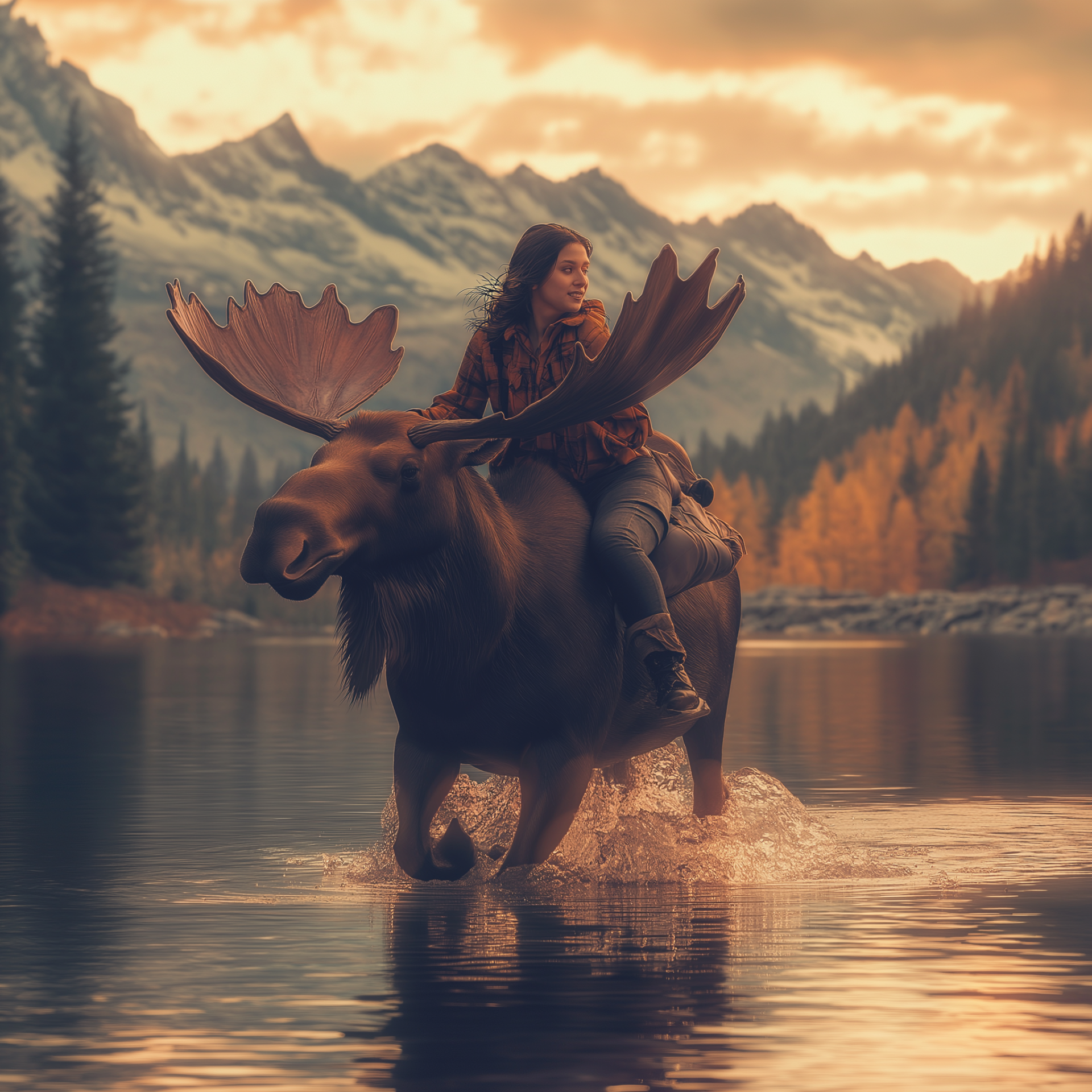 A majestic moose emerges from a tranquil mountain lake, gracefully carrying a beautiful woman. The warm hues of autumn foliage and the soft glow of sunrise create a serene and enchanting atmosphere.