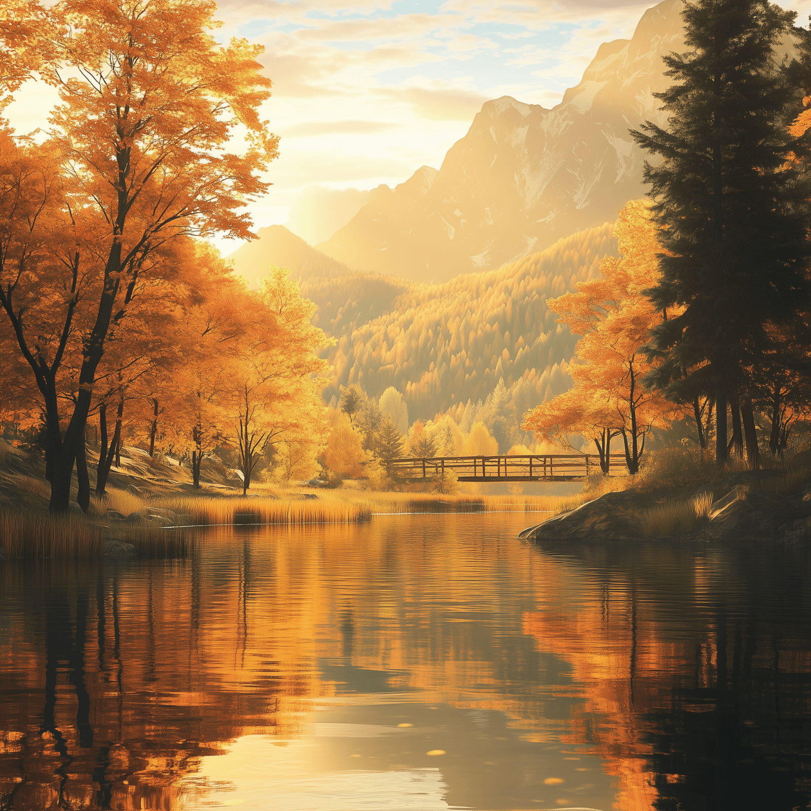 The image depicts a tranquil autumn landscape filled with vibrant hues of orange, yellow, and green. Warm sunlight filters through the trees and reflects gently off the lake, creating a peaceful and captivating atmosphere.