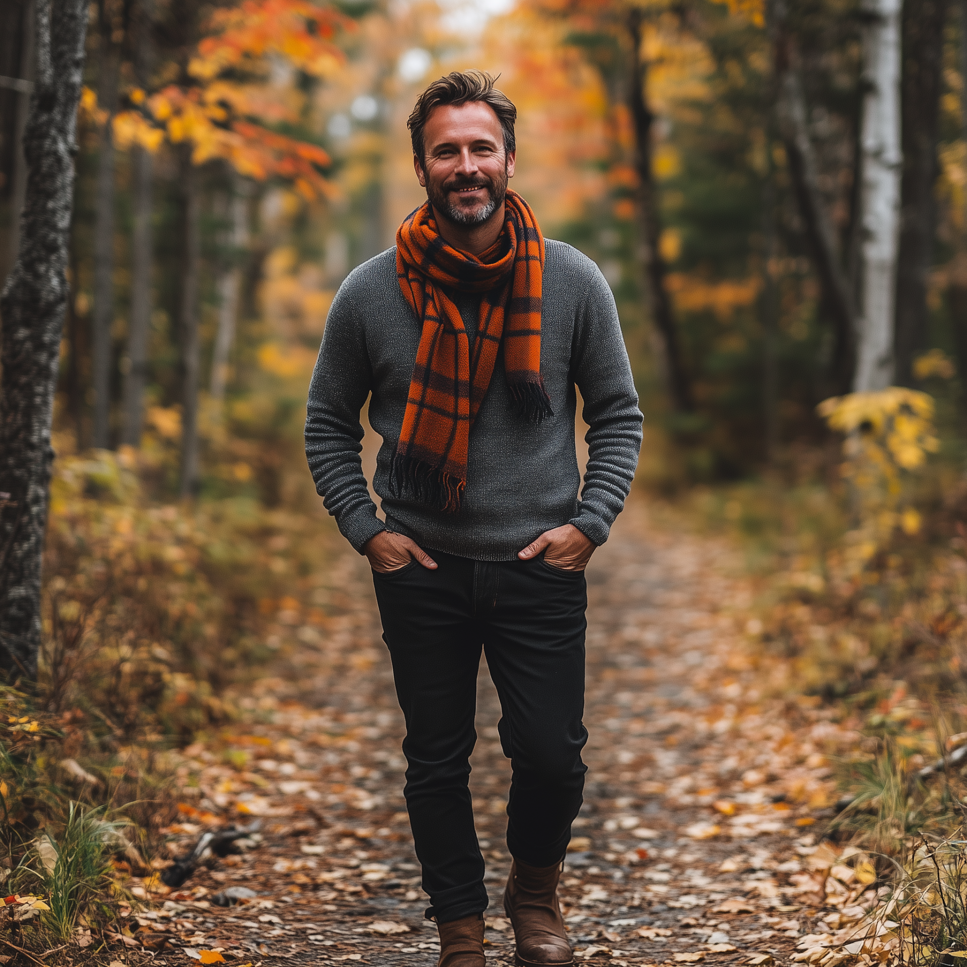 A handsome man stands confidently on a leafy path in an autumn forest, smiling warmly at the camera. The vibrant colors of yellow and red leaves provide a stunning backdrop, enhancing the cozy vibe of the scene.