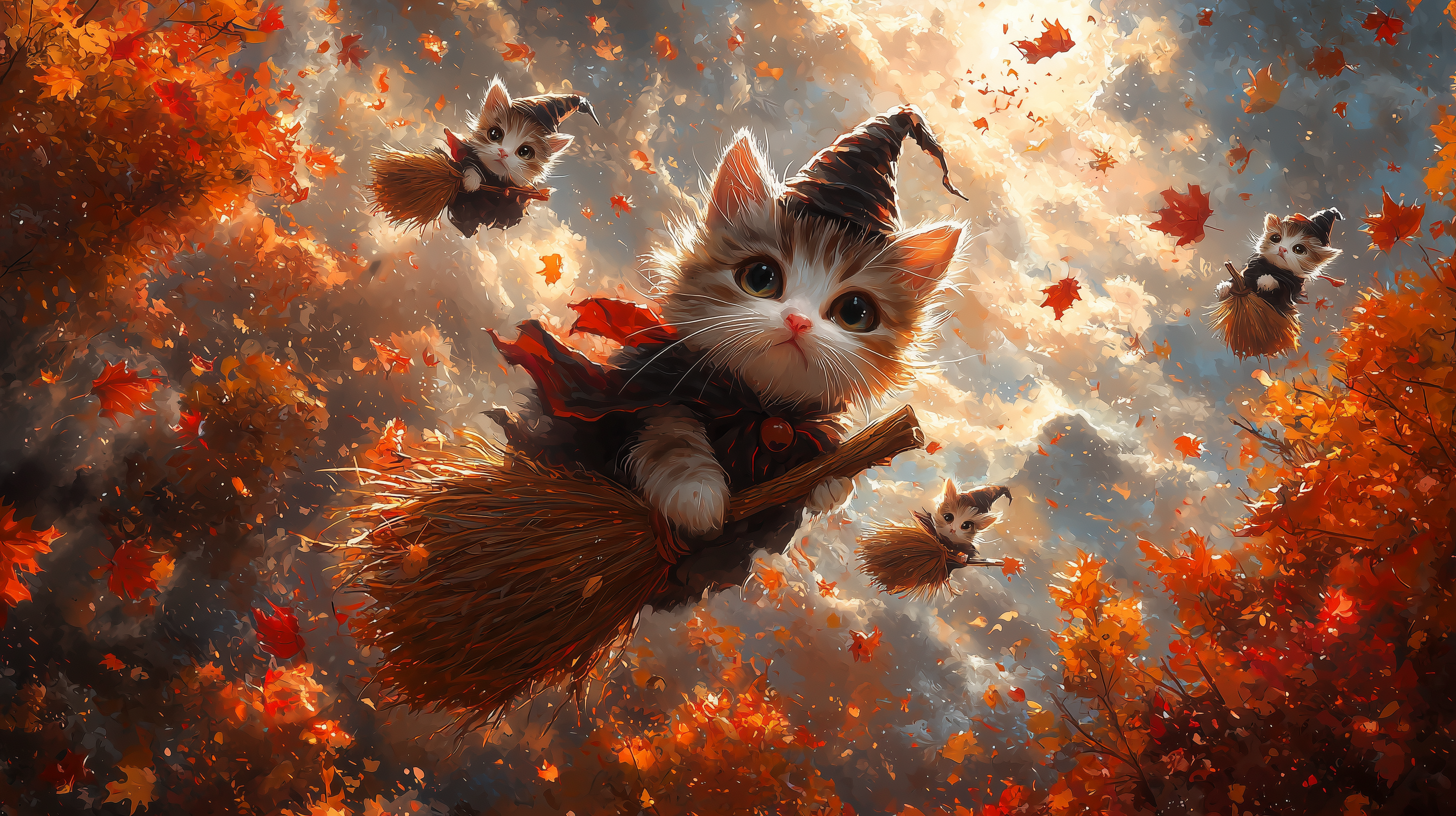 This whimsical illustration captures a charming autumn sky filled with colorful fall leaves. Playful cats dressed as witches soar on brooms, creating a magical and enchanting atmosphere.