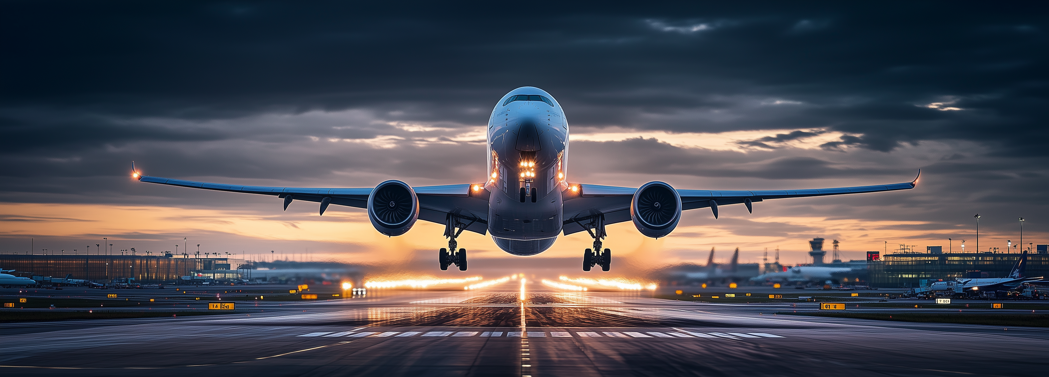 This photograph captures an airplane in mid-takeoff against a stunning twilight sky. The sleek design and powerful engines of the aircraft are highlighted, creating a dynamic sense of movement.