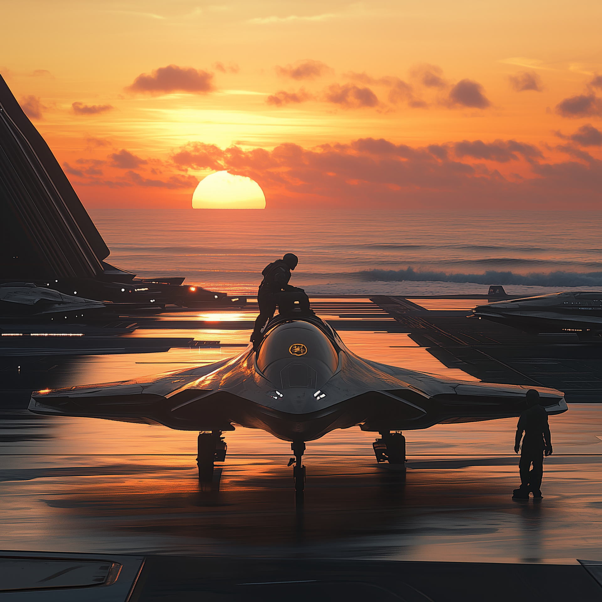 The image captures a lone pilot preparing to enter a sleek starfighter against a stunning sunset backdrop. Warm orange light bathes the landing pads and reflects off the futuristic military structures nearby, creating a cinematic and heroic atmosphere.