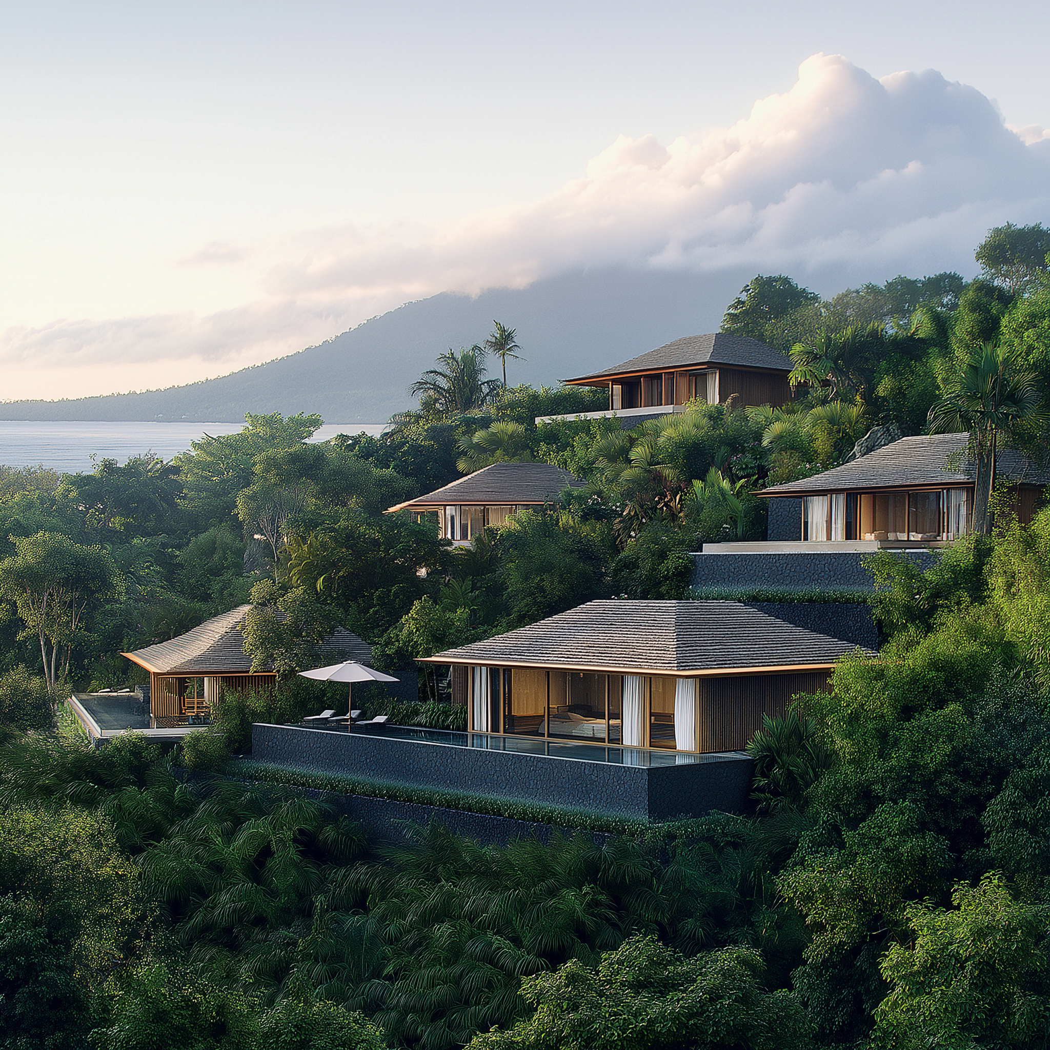 This image captures a breathtaking architectural view of a lavish hillside village in Bali. The design blends seamlessly with the lush greenery, featuring stunning wooden roofs and expansive glass walls that invite the tranquil surroundings in.