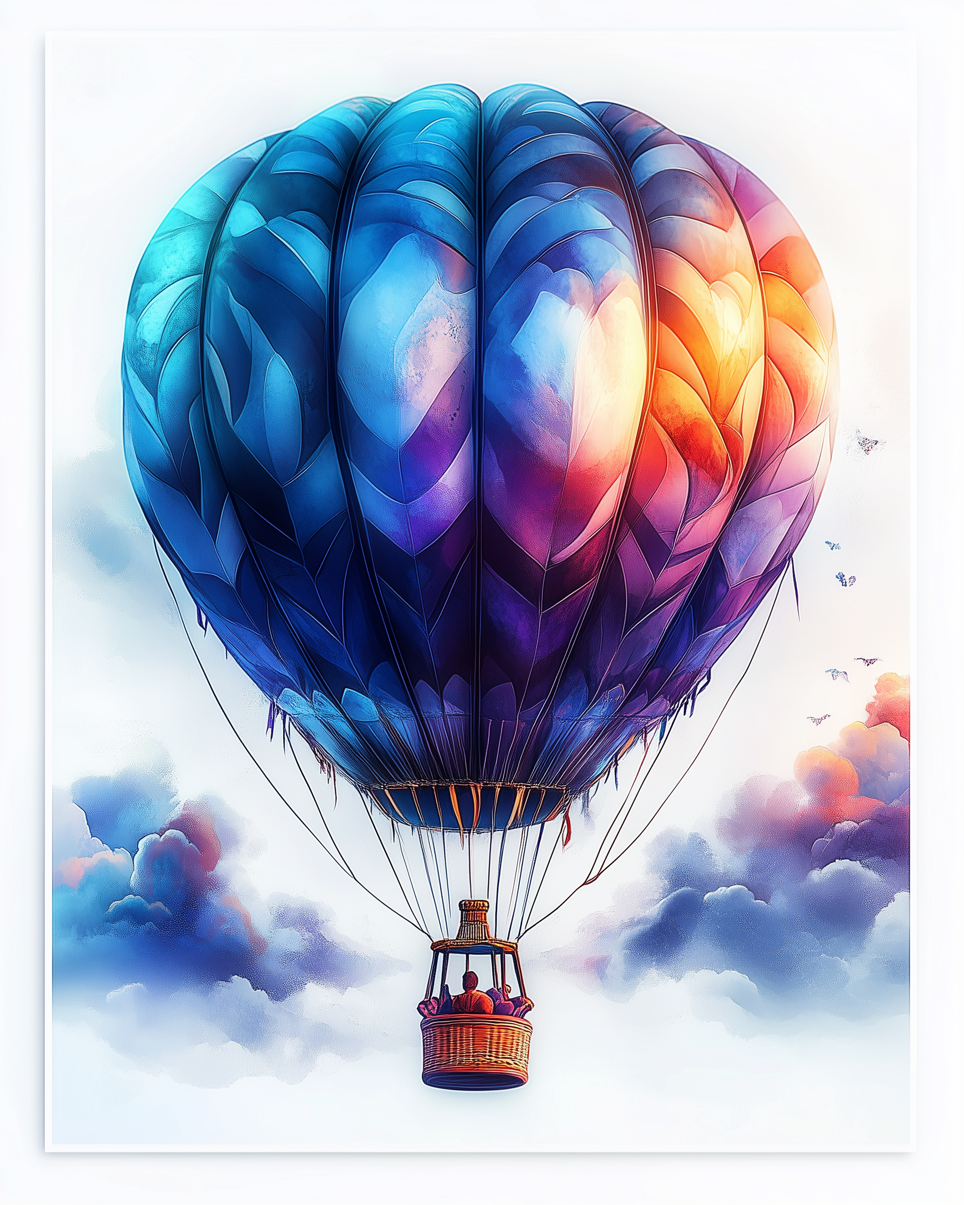 This image showcases a stunning hot air balloon adorned in a mix of light blue, turquoise, and purple hues. The bright colors and clear lines create a captivating perspective that draws the viewer in.