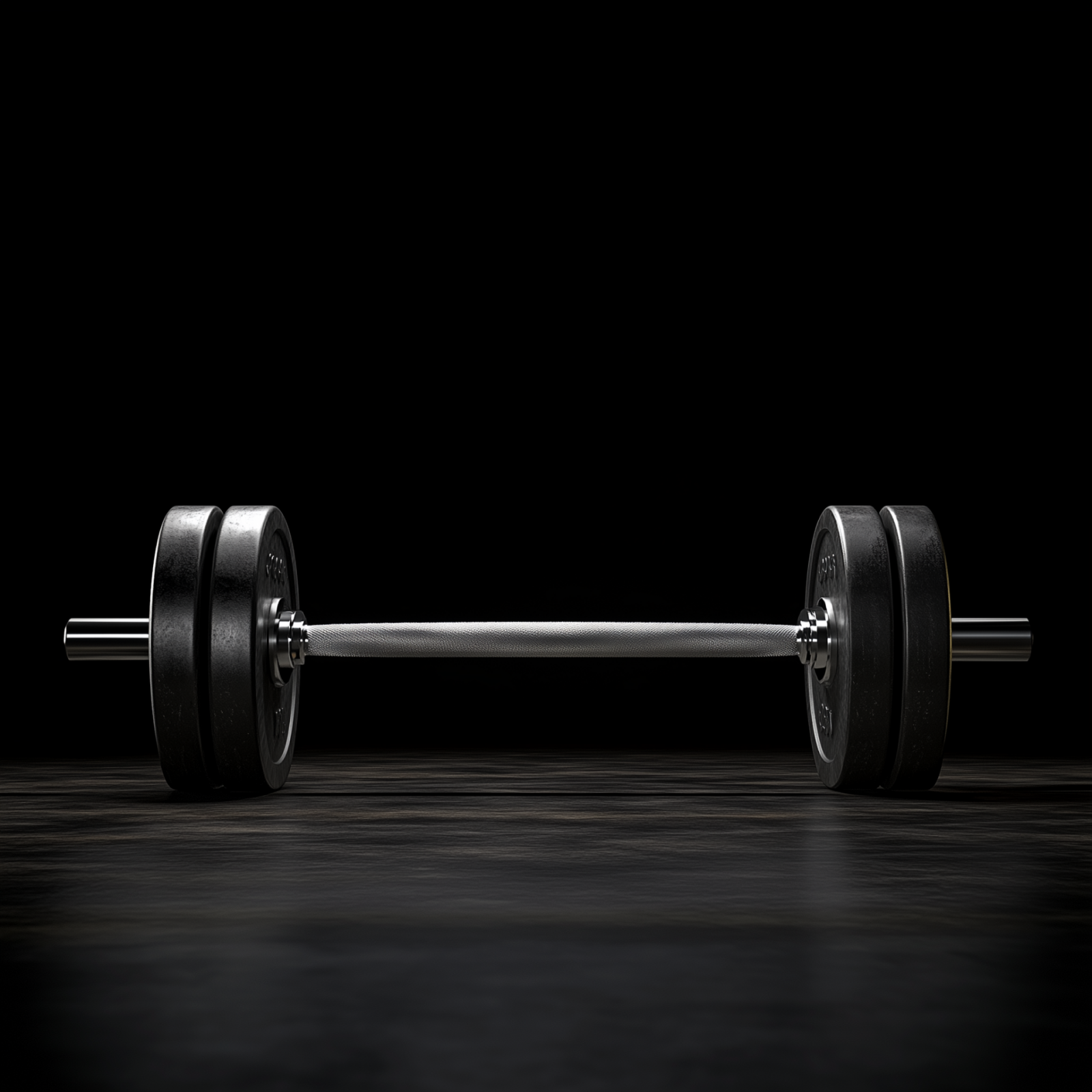 The image features a front view of a barbell loaded with heavy weights, resting on the ground. The stark contrast against the plain black background emphasizes the barbell's form and strength.