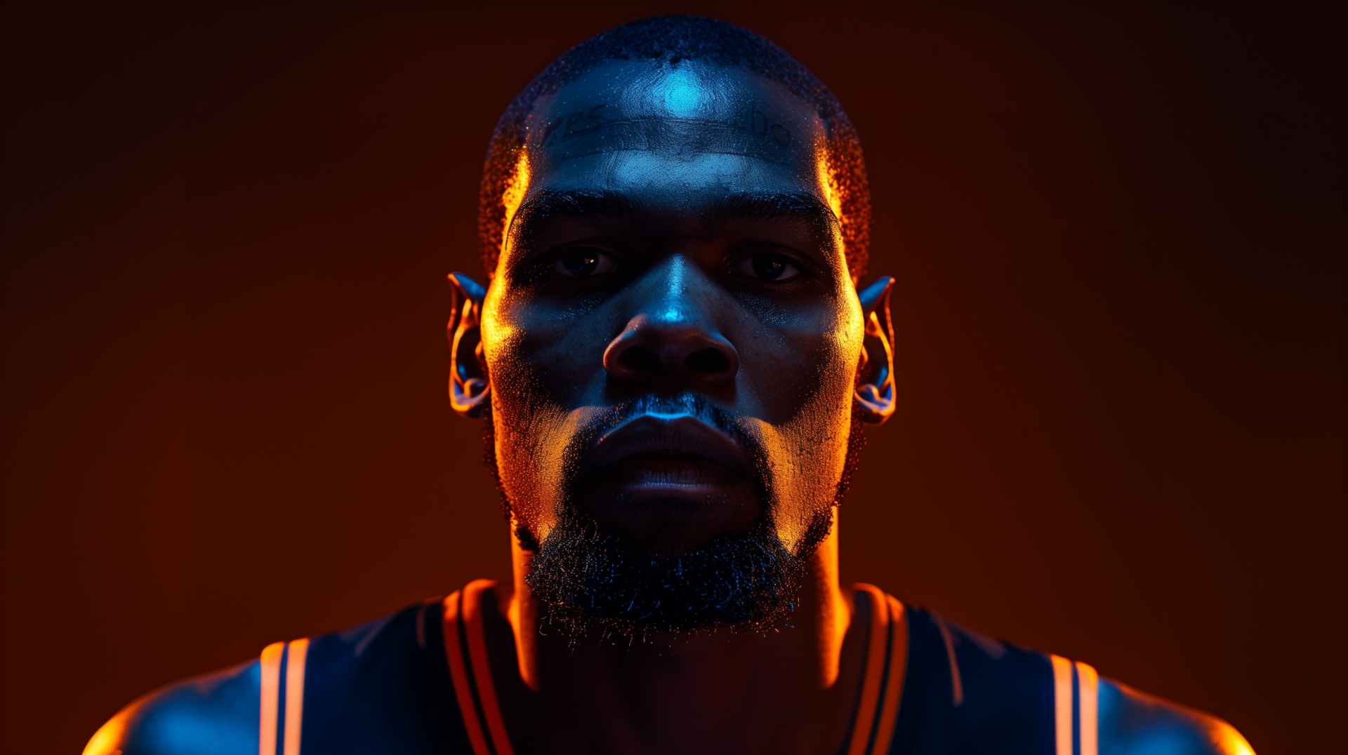 The image features a strong and intense gaze directed at the camera, set against a stark black studio backdrop. Dramatic orange neon lights create heavy shadows that enhance the overall mood of the photograph.