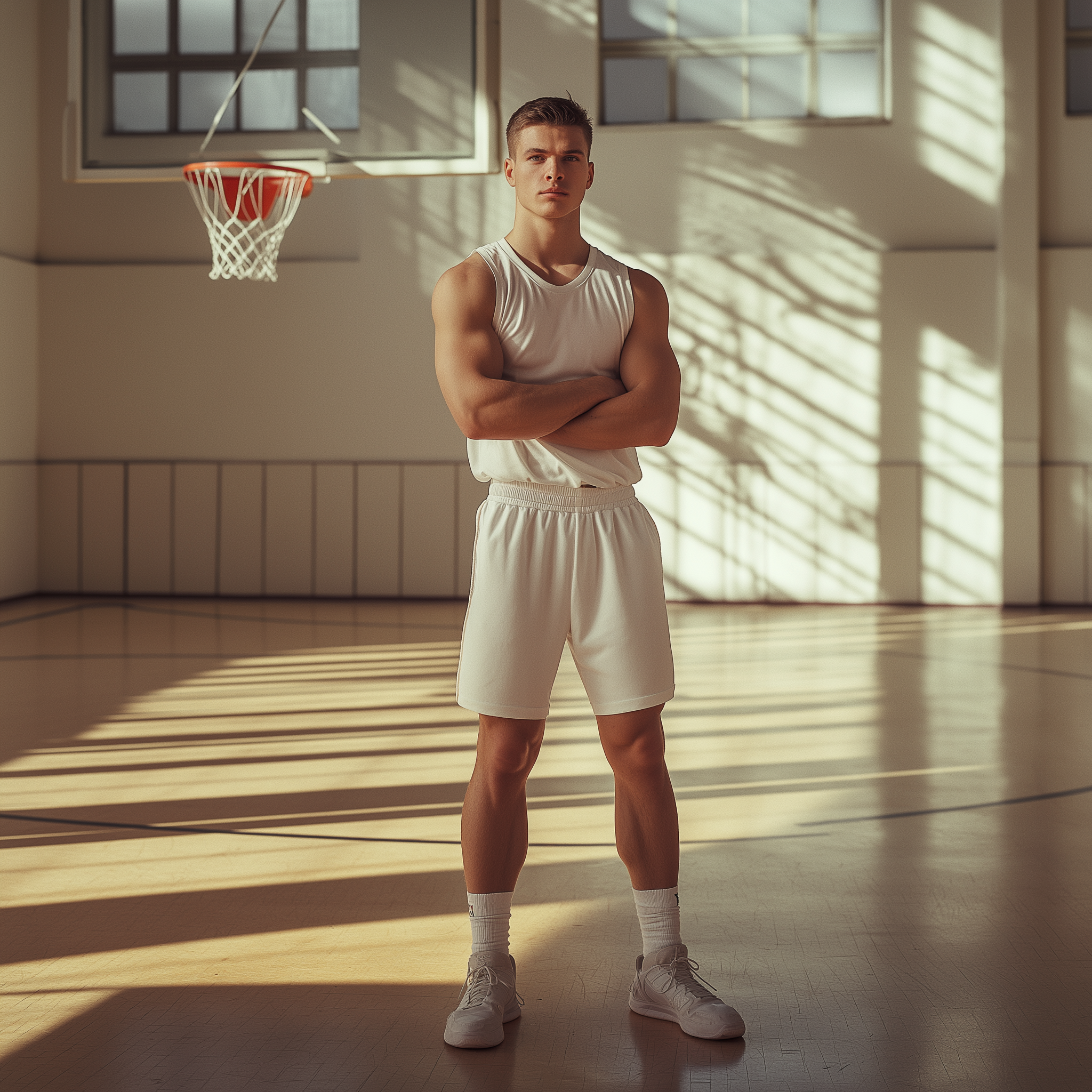 The image features a European basketball player dressed entirely in white, striking a pose at a basketball court. The high-quality photograph captures the intensity and energy of the sport, showcasing the player's athleticism and the pristine surroundings.