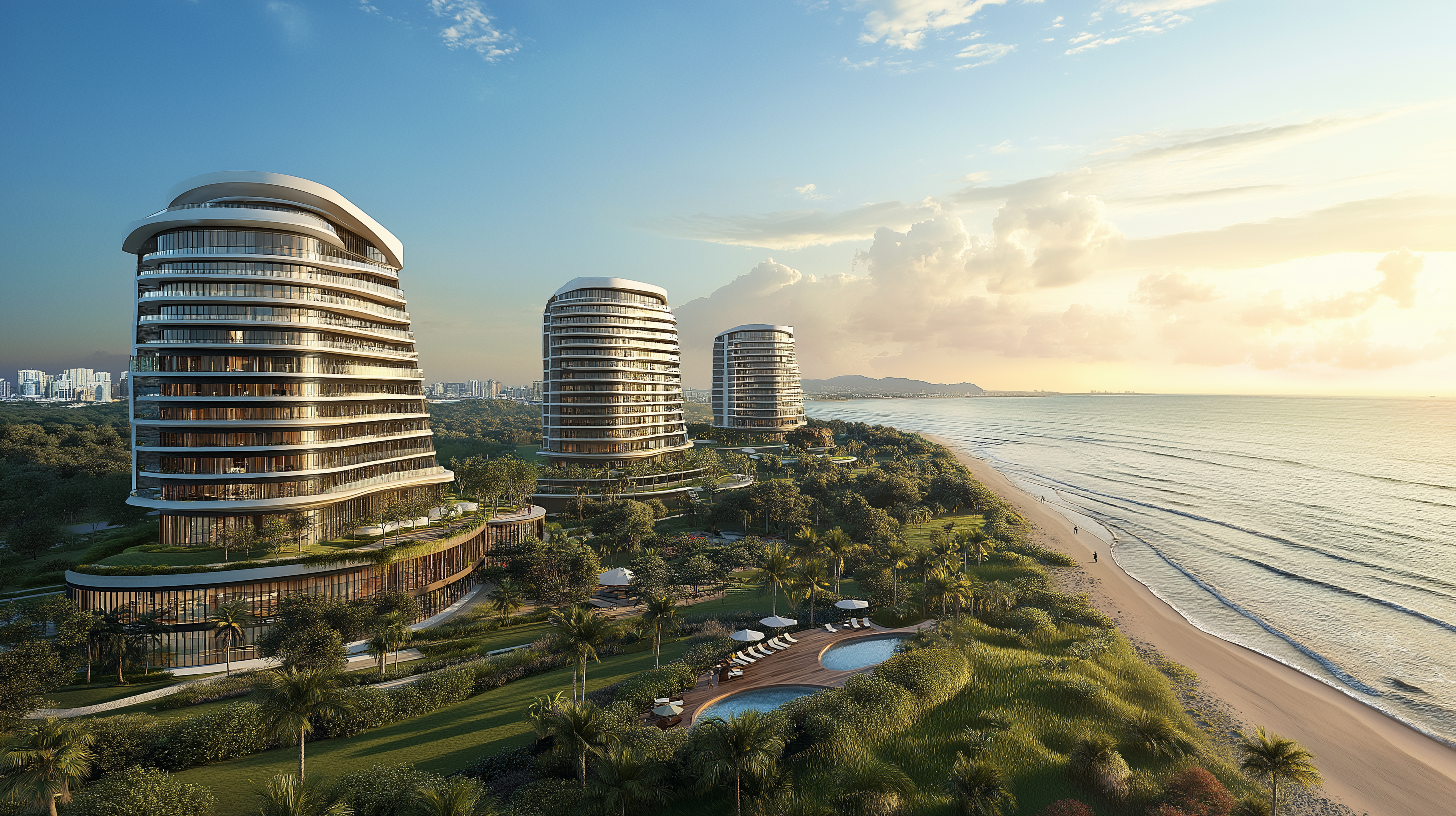 The image showcases a beautiful ocean front hotel complex with three low-rise buildings positioned along the shoreline. The scene is vibrant, encompassing clear blue skies, gentle waves, and lush landscaping surrounding the hotel.
