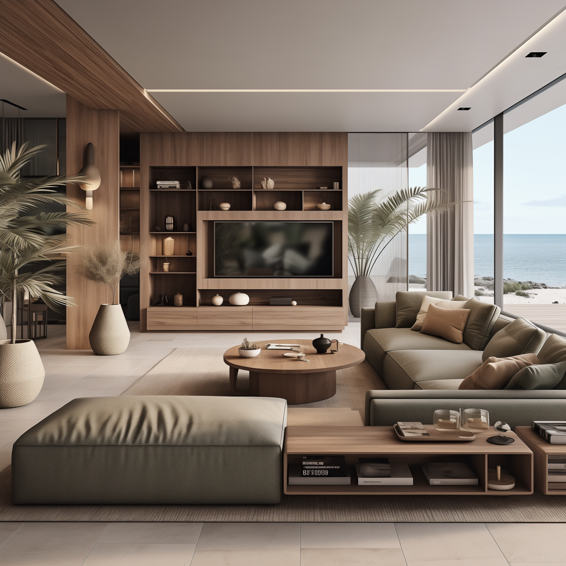 The spacious living room features a cozy sofa positioned centrally, facing a stylish TV unit. The dark greige walls and Japandi style elements create a serene and inviting atmosphere.