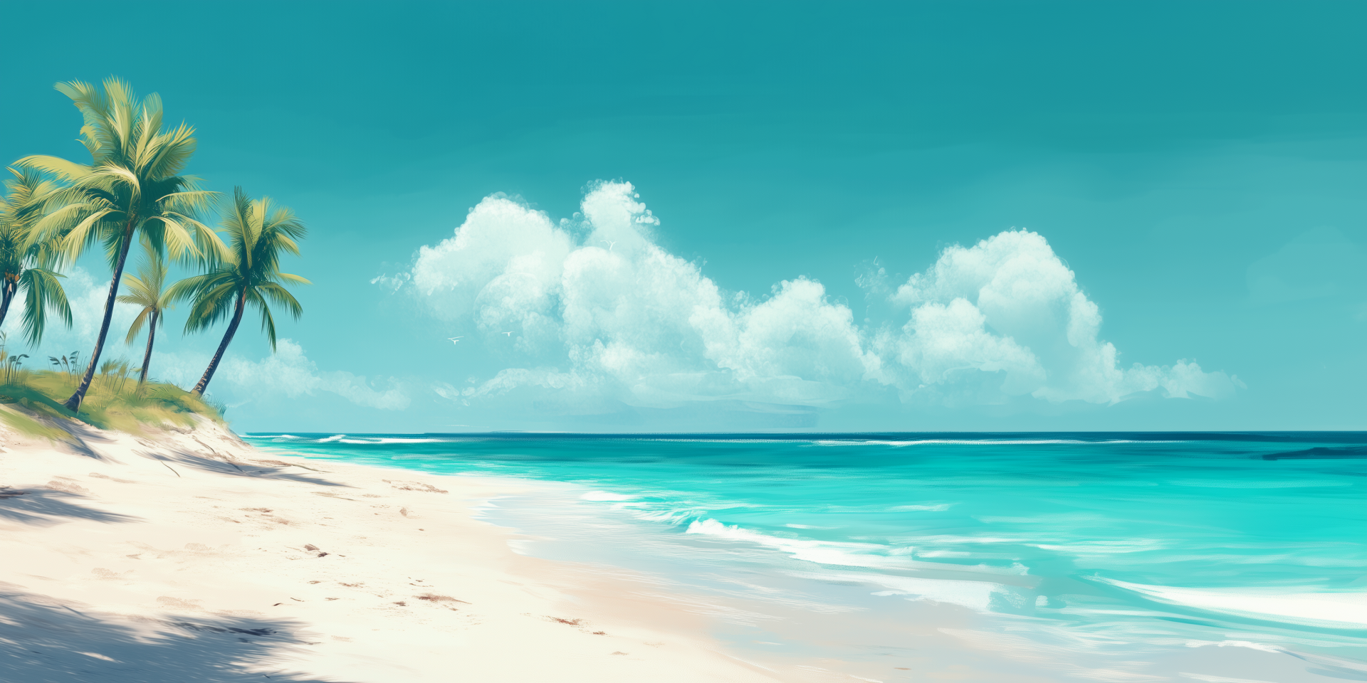 The image captures a serene beach landscape adorned with swaying palm trees under a bright sun. The gentle turquoise waters shimmer invitingly, complemented by soft pastel shades in the sky.