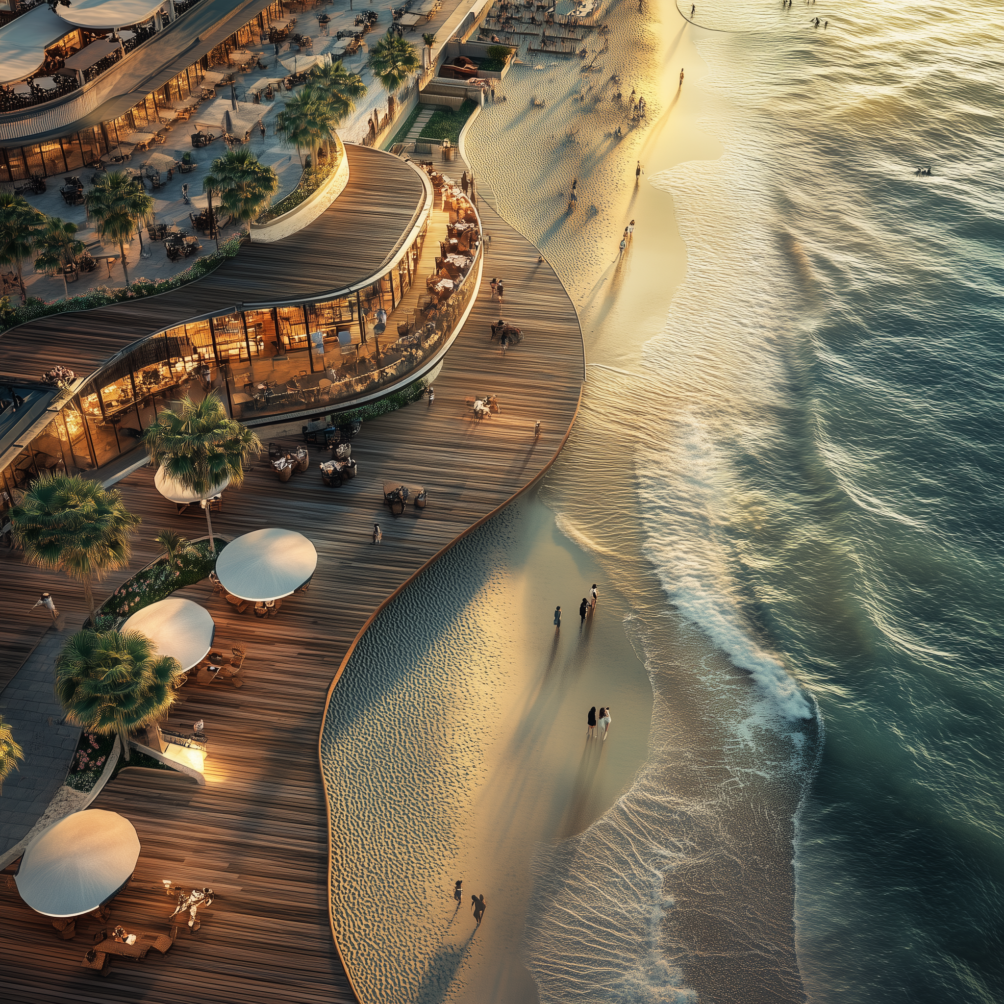 This aerial image showcases a vibrant and modern boardwalk that runs alongside a picturesque beach. Lined with an array of cozy coffee shops and inviting restaurants, the scene captures a lively atmosphere perfect for relaxation and enjoyment.