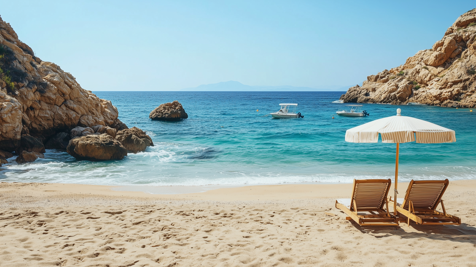 This tranquil beach scene features soft sand and small fishing boats gently bobbing in the clear blue ocean. The image captures a peaceful atmosphere with inviting beach chairs and an umbrella ready for relaxation beneath a clear sky.