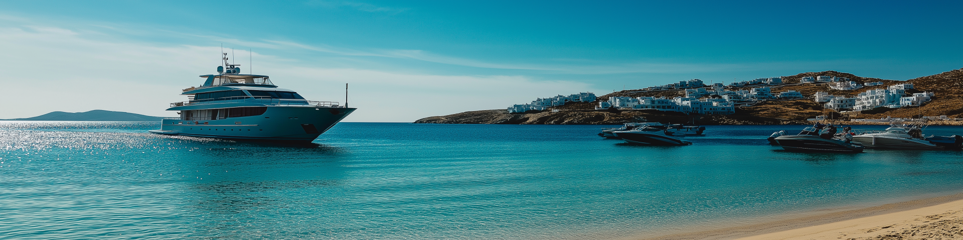 The image showcases a stunning beach view in Mykonos, featuring crystal-clear waters and vibrant sandy shores. In the foreground, a luxurious yacht glistens in the sunlight, surrounded by energetic jet skis enjoying the waves.