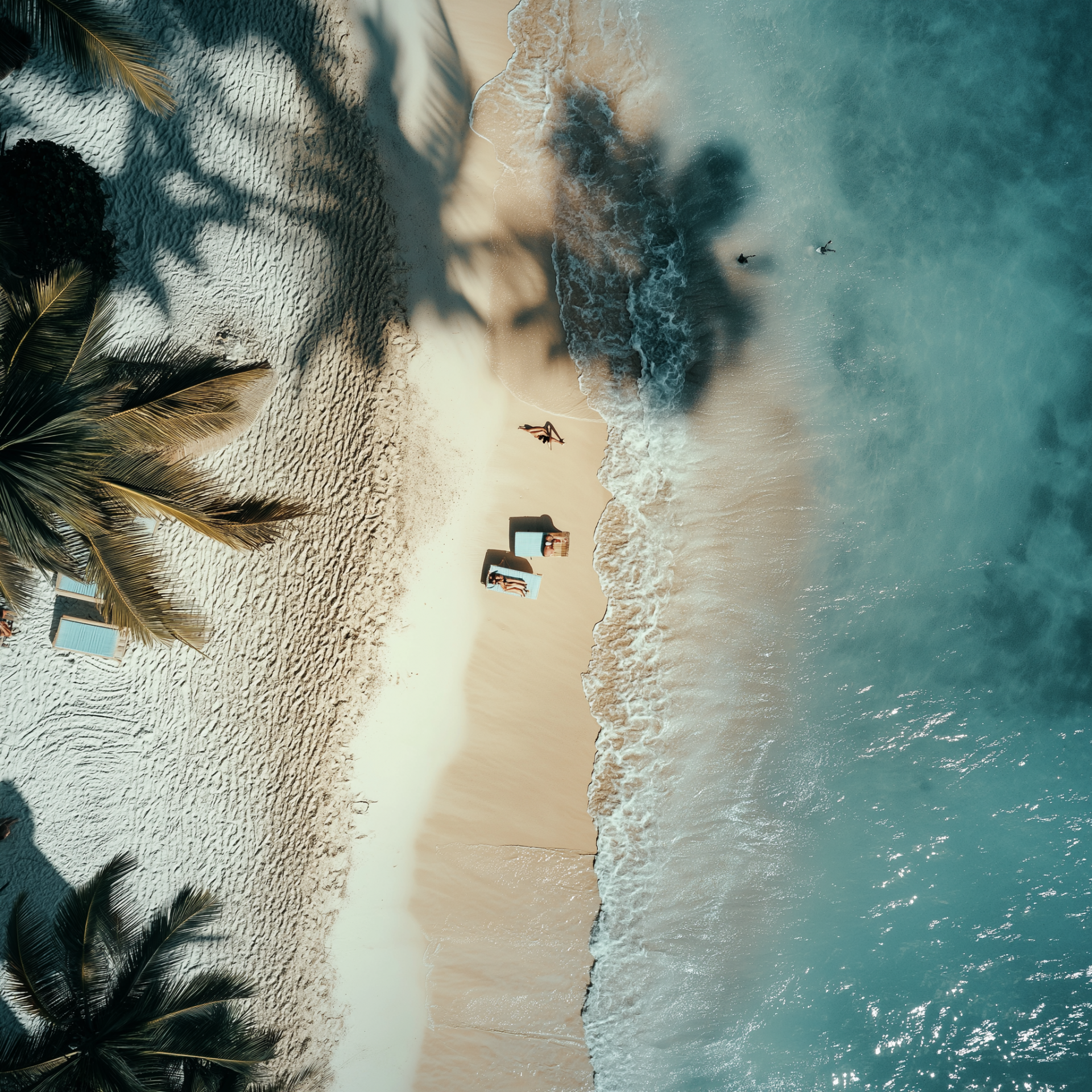 This image captures a stunning top view of a beachside scene, showcasing the vibrant colors of the sand and water. The cinematic lighting creates strong shadows and highlights unique angles, making the composition visually striking.