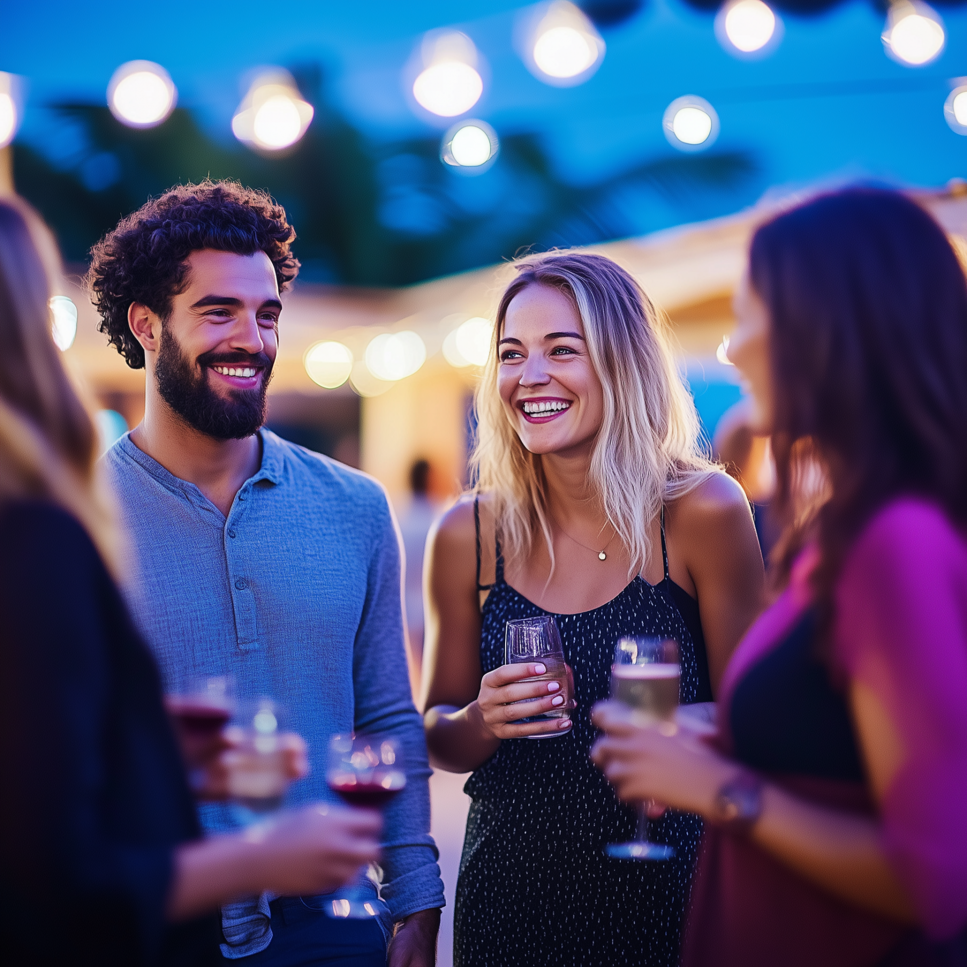 A group of diverse adults enjoying a networking event under the starlit sky at a beach cabana. The ambiance is lively and relaxed, with soft lighting adding to the warm atmosphere of friendship and connection.