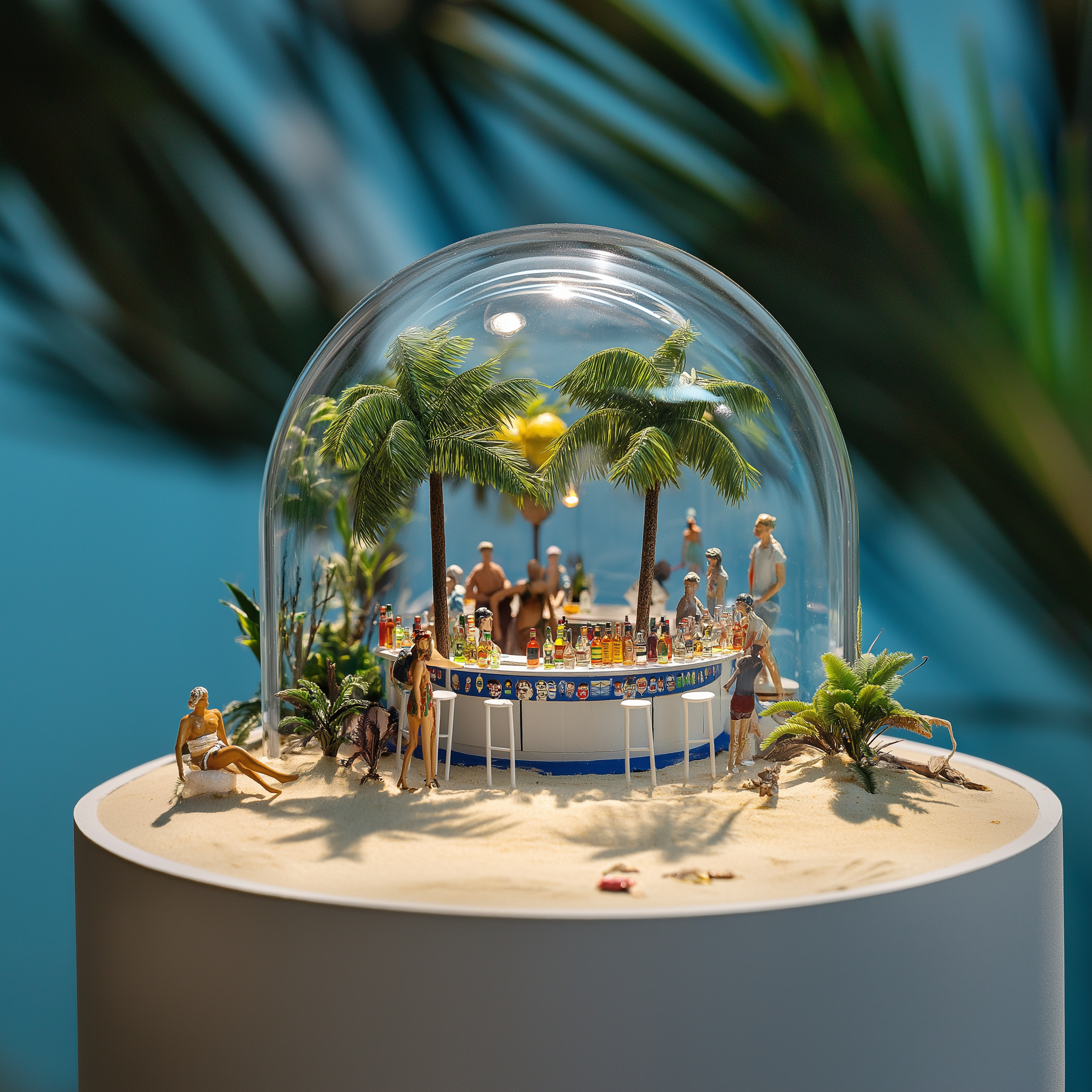 The image depicts a miniature glass dome showcasing an Ibiza-style party bar set on a sandy beach. Inside, stylish model figures enjoy the vibrant atmosphere, surrounded by a minimalist design that adds a contemporary touch.
