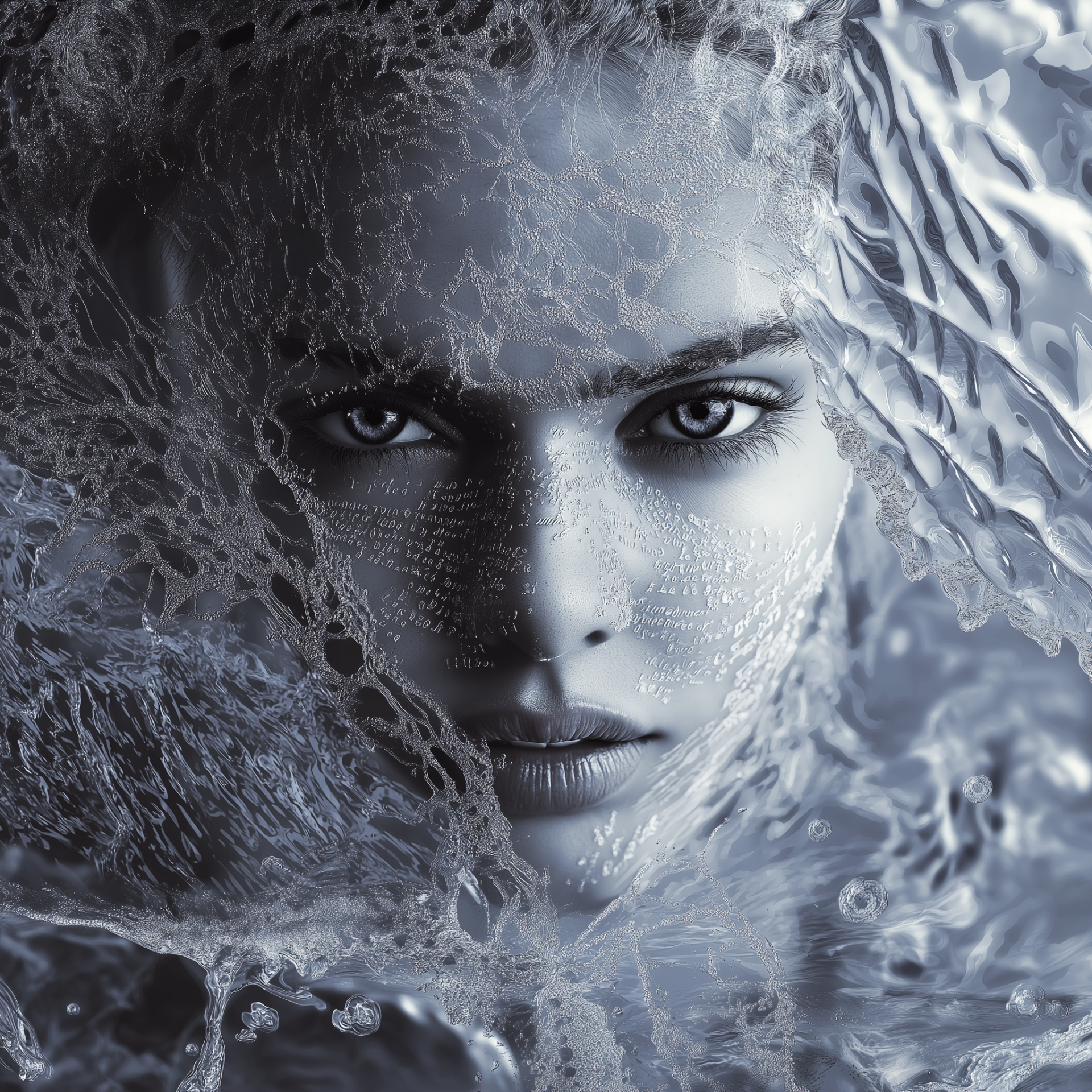 The image captures a stunning woman's face, beautifully adorned with dew and intricate character patterns resembling flowing water. Her expression hints at a smile, with a softly blurred background that emphasizes the sharp detail of her features.