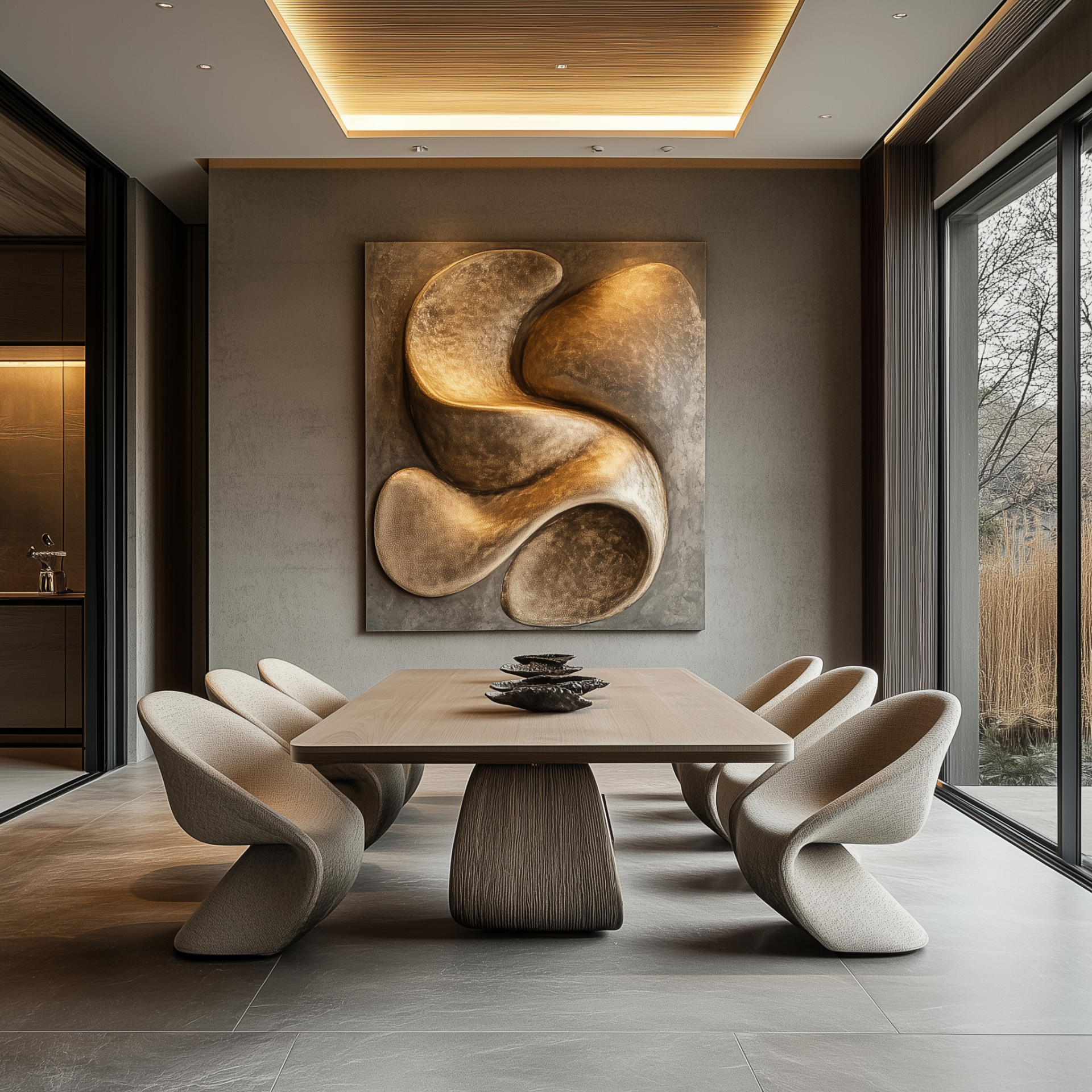 This dining room features a clean and minimalist design with a stylish pendant light hanging above an elegant wooden table. The warm lighting creates a cozy atmosphere that enhances the sculptural art piece on the wall and the comfortable chairs.