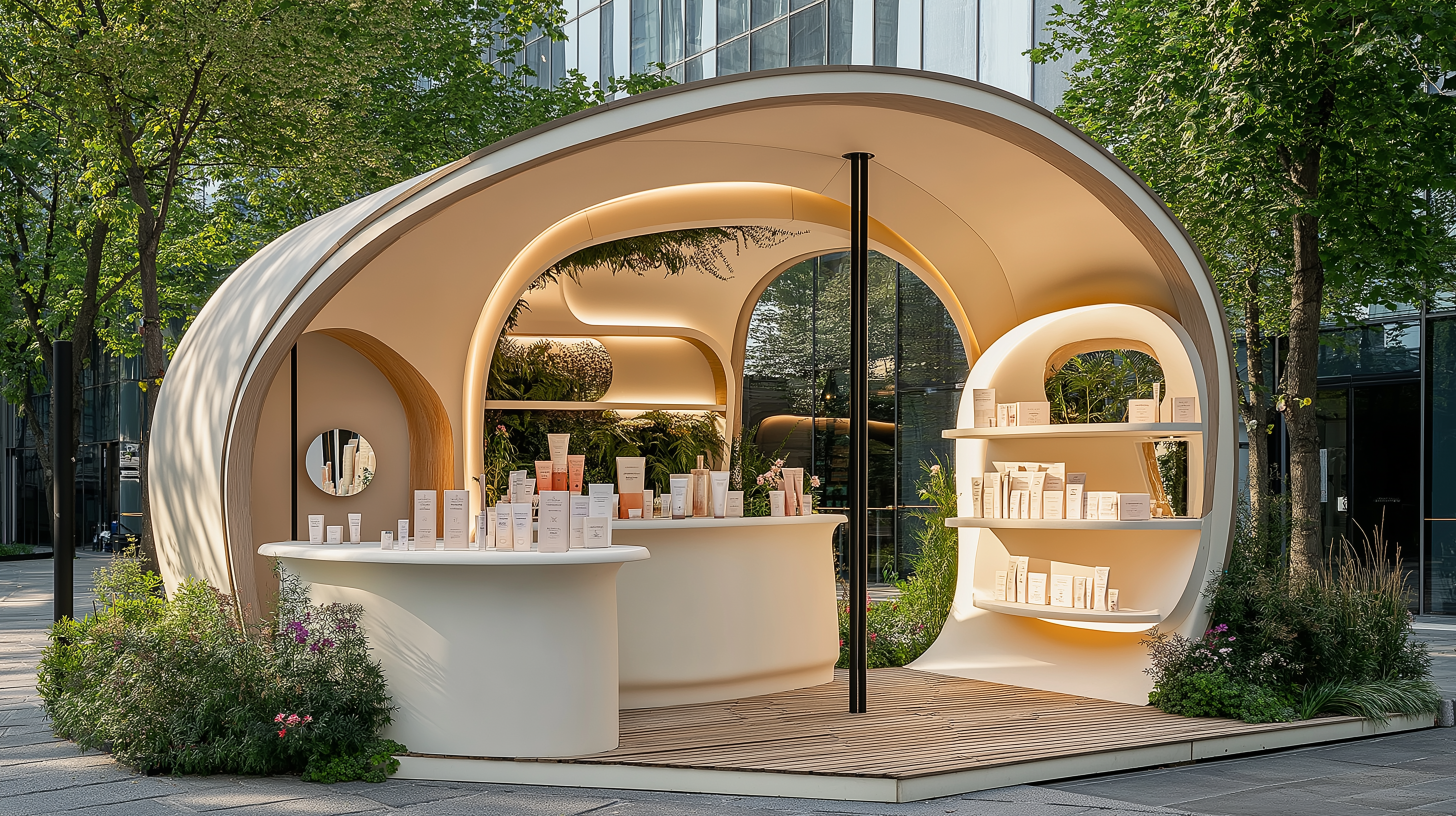 The image showcases a modern beauty pop up store designed as an open beauty cream jar. It is surrounded by lush greenery and vibrant flowers, creating a fresh and inviting atmosphere.