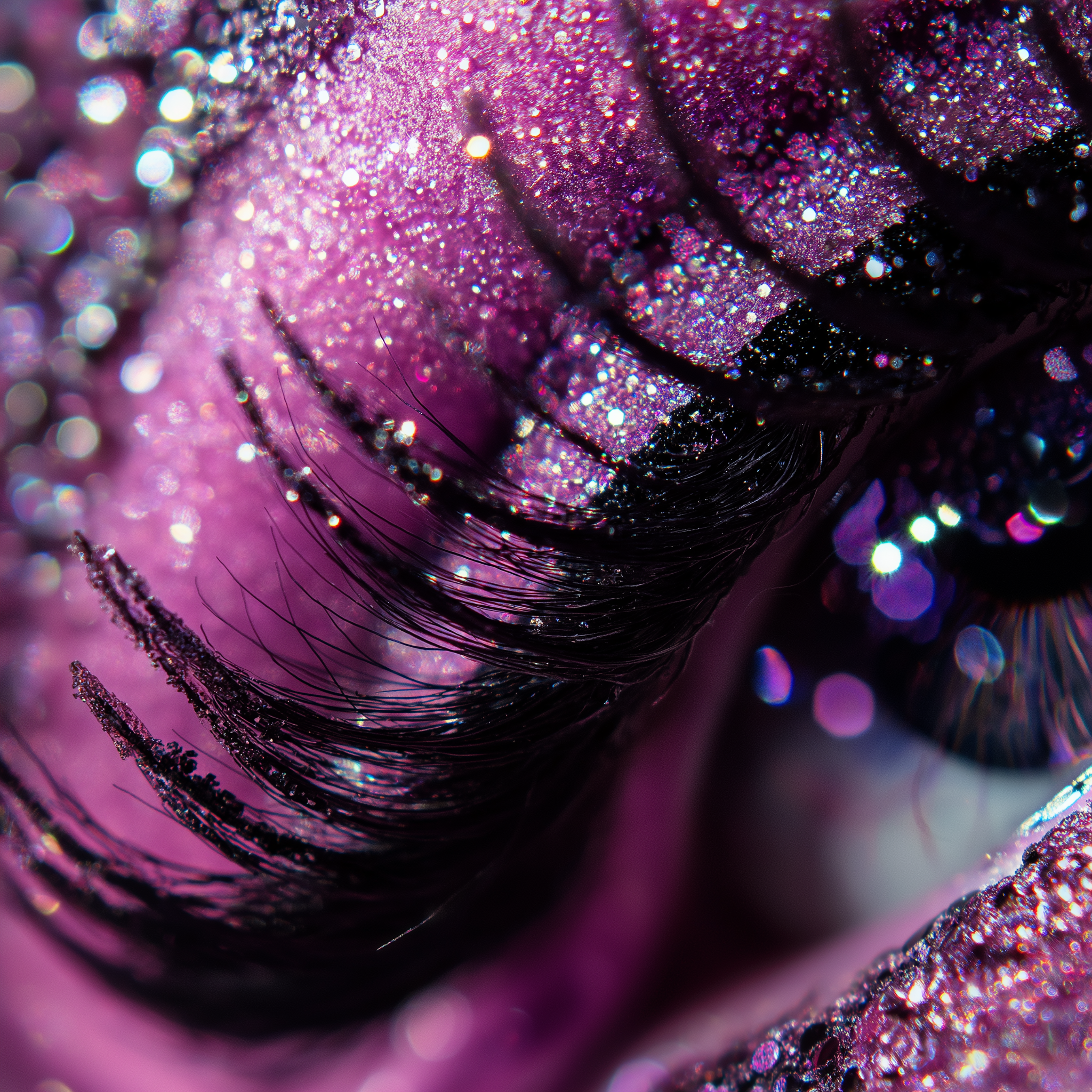 The image showcases a flatlay arrangement of eyelashes with vibrant colors such as magenta, accented by black and silver sparkles. The composition creates a visually appealing contrast that draws attention and adds a touch of glamour.