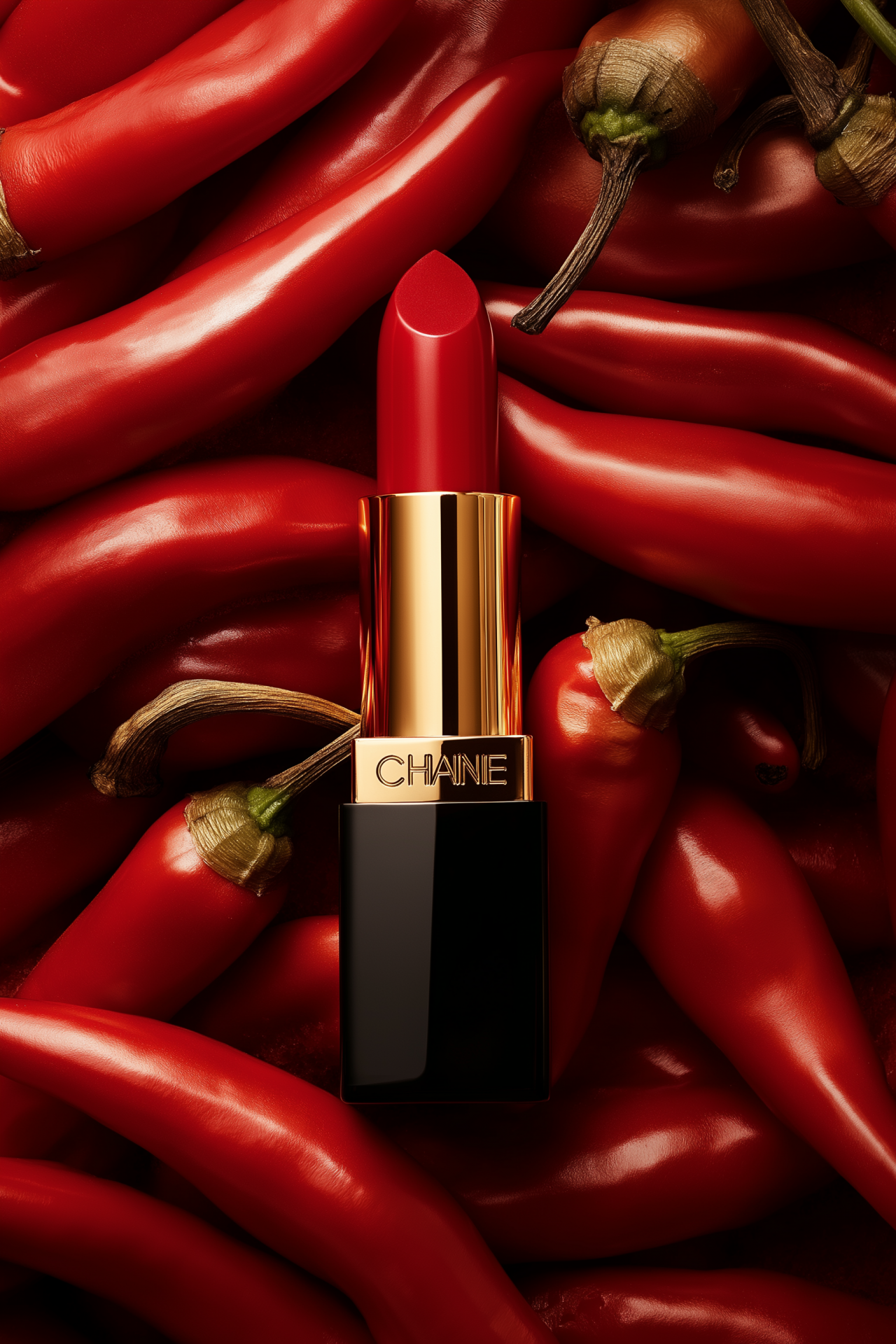 This close-up image features a striking red lipstick mockup elegantly positioned atop a vibrant pile of red peppers. The rich colors and textures create a visually appealing contrast, highlighting both the lipstick and the fresh produce.