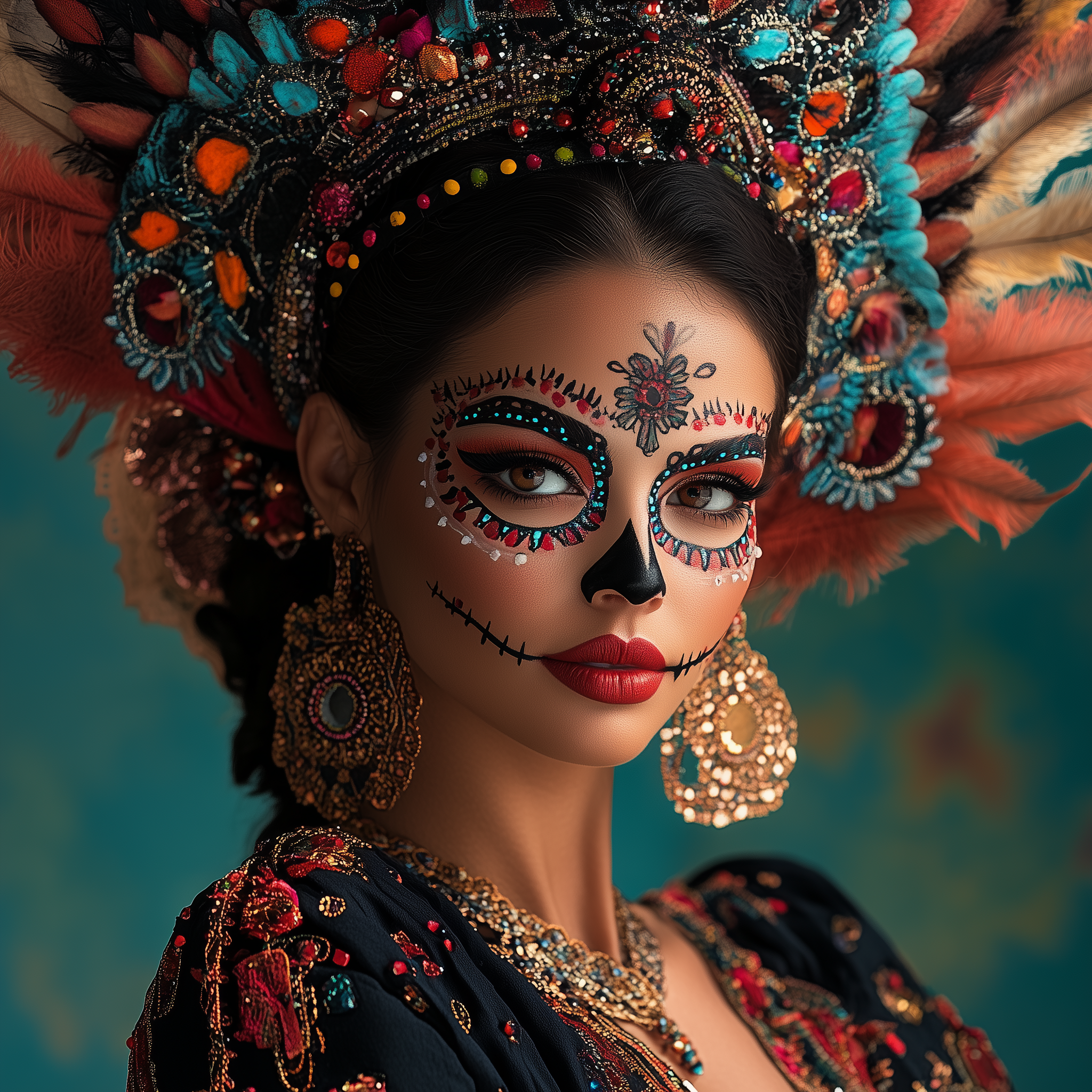 This image features a striking headshot of a model adorned with vibrant Day of the Dead makeup and an elaborate headdress. The studio lighting enhances the colorful details and creates a captivating atmosphere.