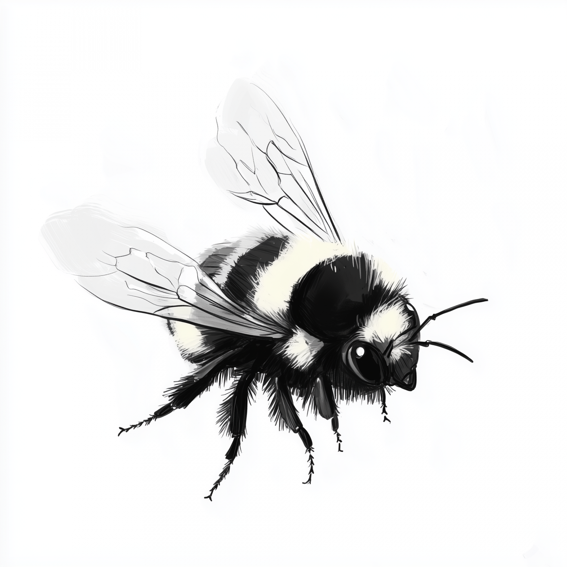 This illustration features a cute and realistic sketch of a bumblebee with both wings displayed. The high contrast black and white style creates a striking visual against the clean white background.