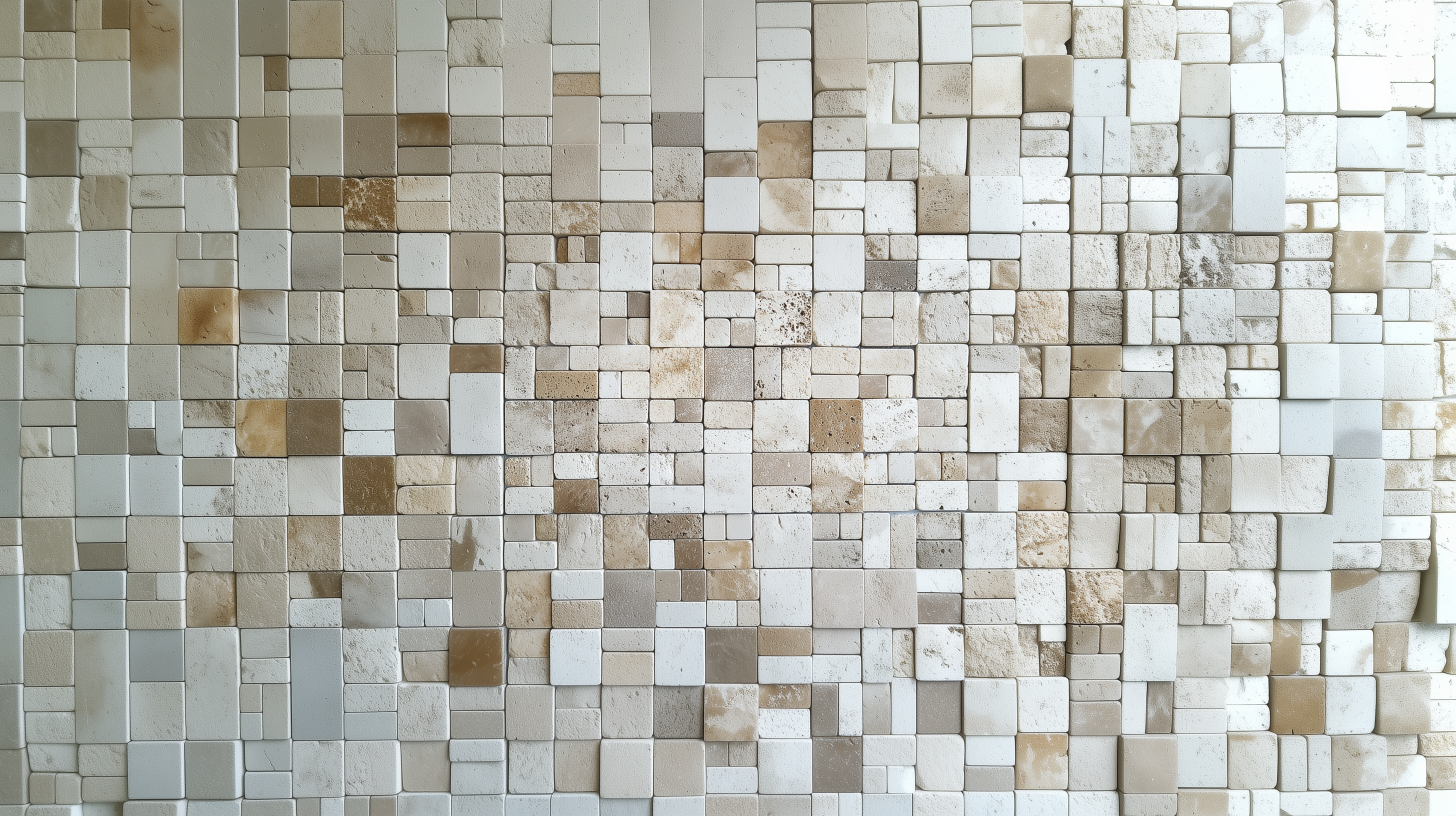 This image features a beautifully arranged floor mosaic with a combination of rectangular and square shapes. The beige travertine texture gives the design a warm and inviting feel.