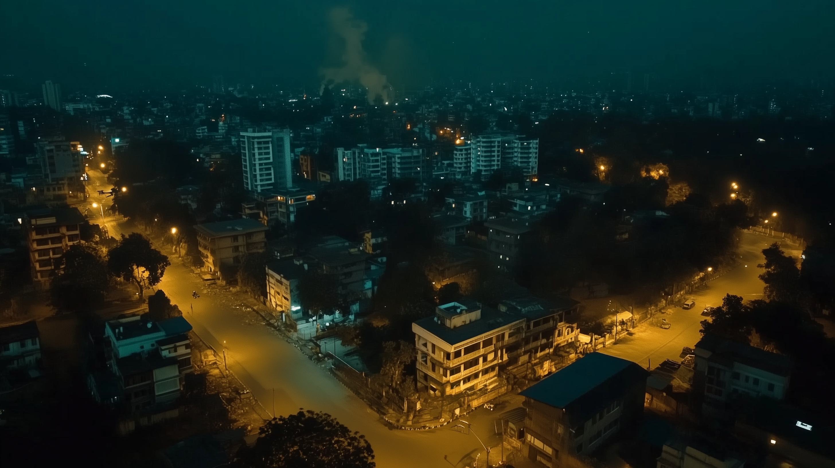 The image depicts a serene night view of Bangalore's residential streets illuminated by street lights and the faint glow of houses. In the distance, the iconic skyline reveals a mix of cultural landmarks such as mosques, churches, and temples, surrounded by a tranquil atmosphere.