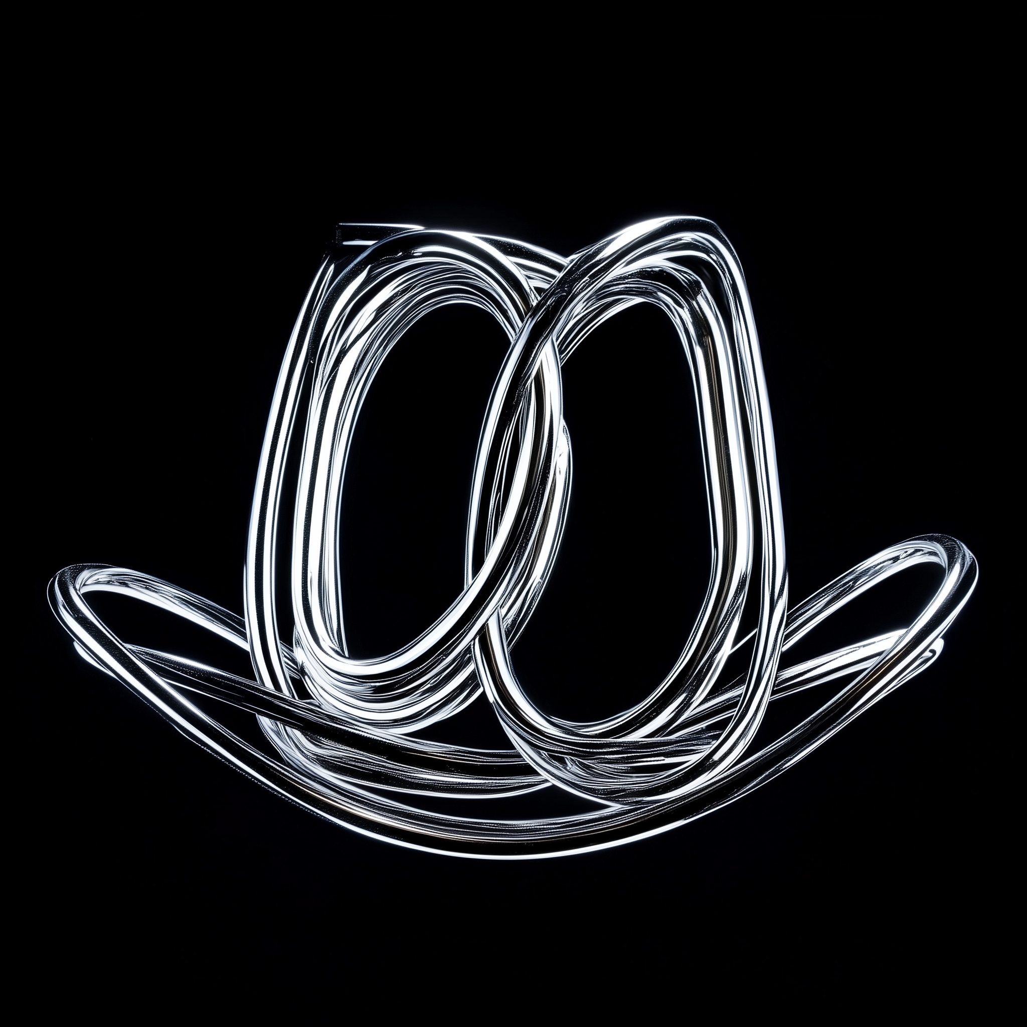 The image features a minimalistic design of a cowboy hat, stylized as an icon made from bent chrome wire. Its sleek and shiny appearance gives it a modern and elegant feel, embodying simplicity and creativity.