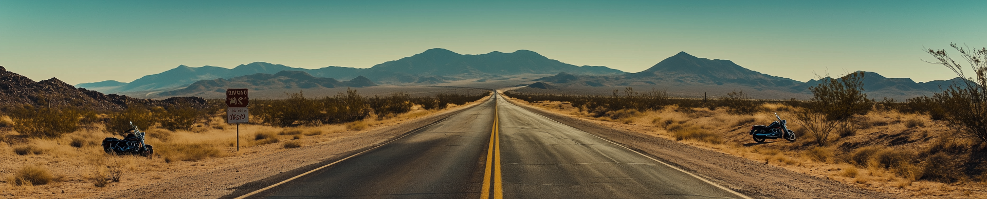This image showcases a side view of a long, winding road reminiscent of classic American routes. The scene is filled with several Harley Davison motorcycles, evoking a sense of adventure and freedom on the open road.