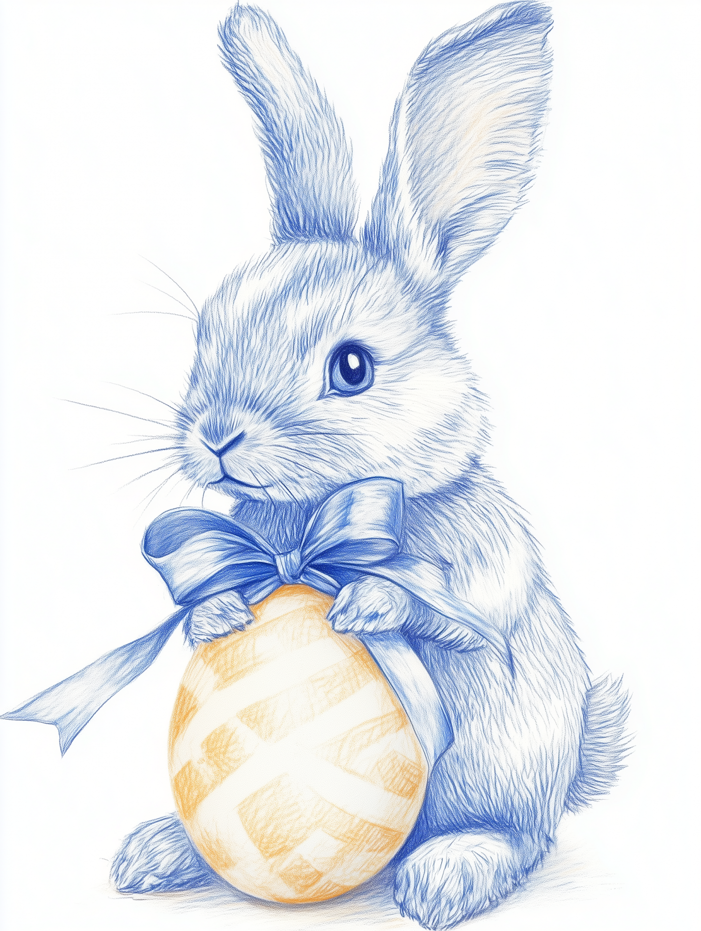This illustration features an adorable blue rabbit holding an egg delicately tied with a ribbon. The drawing is done in a soft pencil style reminiscent of classic children's books, set against a clean white background.