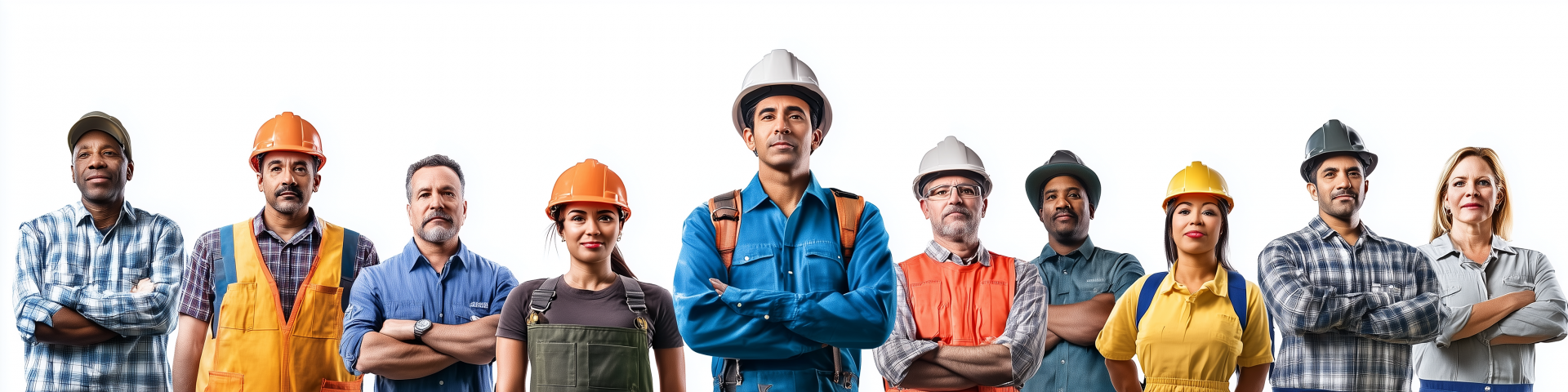 This image showcases a diverse group of blue collar workers from various races and trades standing united behind a central figure. The scene is photo realistic with a transparent background, emphasizing the solidarity among different manual professions.