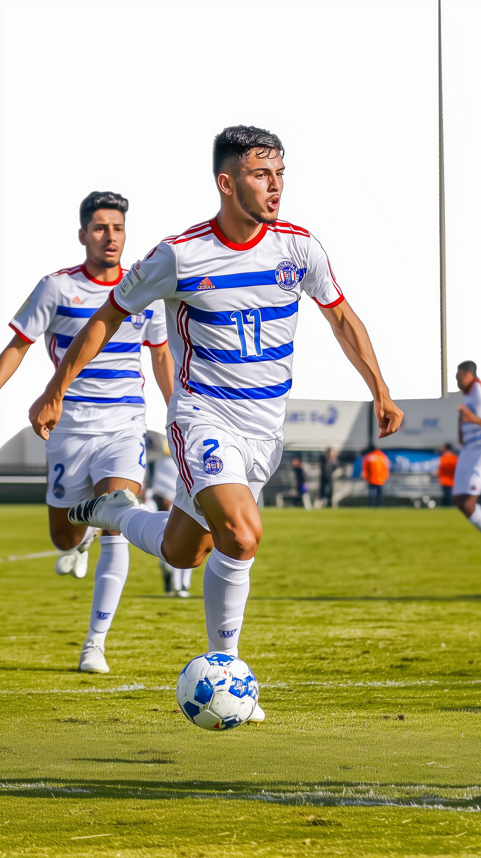 A dynamic image capturing a soccer player in a white jersey with blue horizontal stripes, paired with white shorts, seen from a side view in motion without any background.