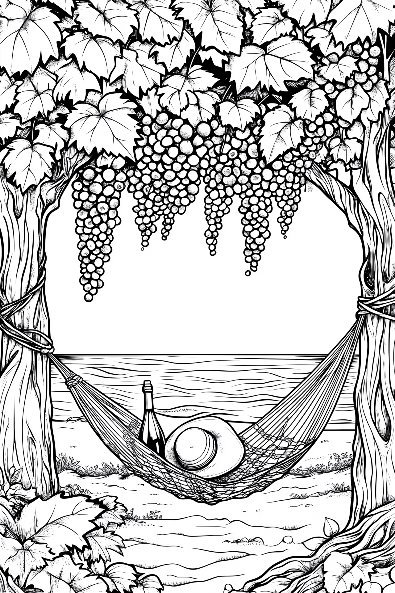 The image captures a serene scene with two cork bottle trees framed by wine grapes. A cozy hammock adorned with a hat and a bottle of wine hangs between the trees, set against a picturesque beach and sunset backdrop in minimalistic line art style.