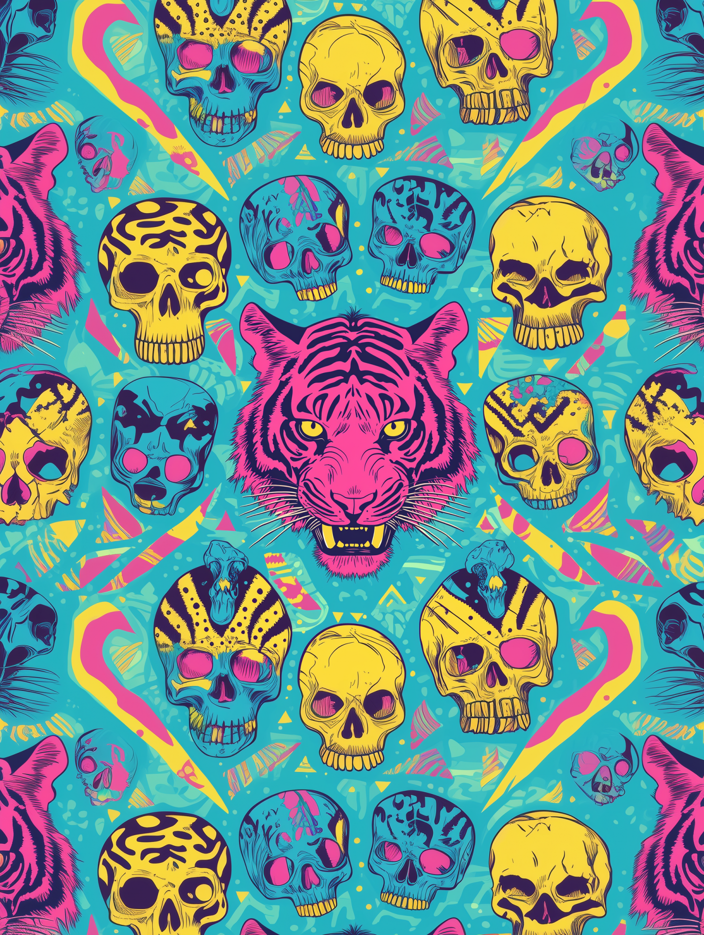 The image features a vibrant pink tiger head surrounded by an array of blue and yellow skulls, each adorned with unique patterns. Set against a pastel turquoise background, the playful geometric shapes create a lively and artistic feel.