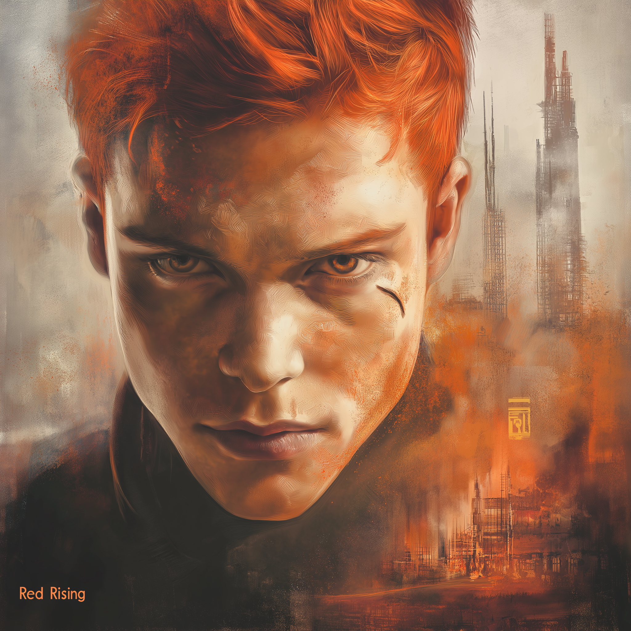 The image features a young man with rusty red hair and intense eyes, set against a futuristic, dystopian background of Mars. The contrasting elements of the harsh mining landscape and the luxurious Gold society create a compelling scene that embodies the epic struggle and revolution.