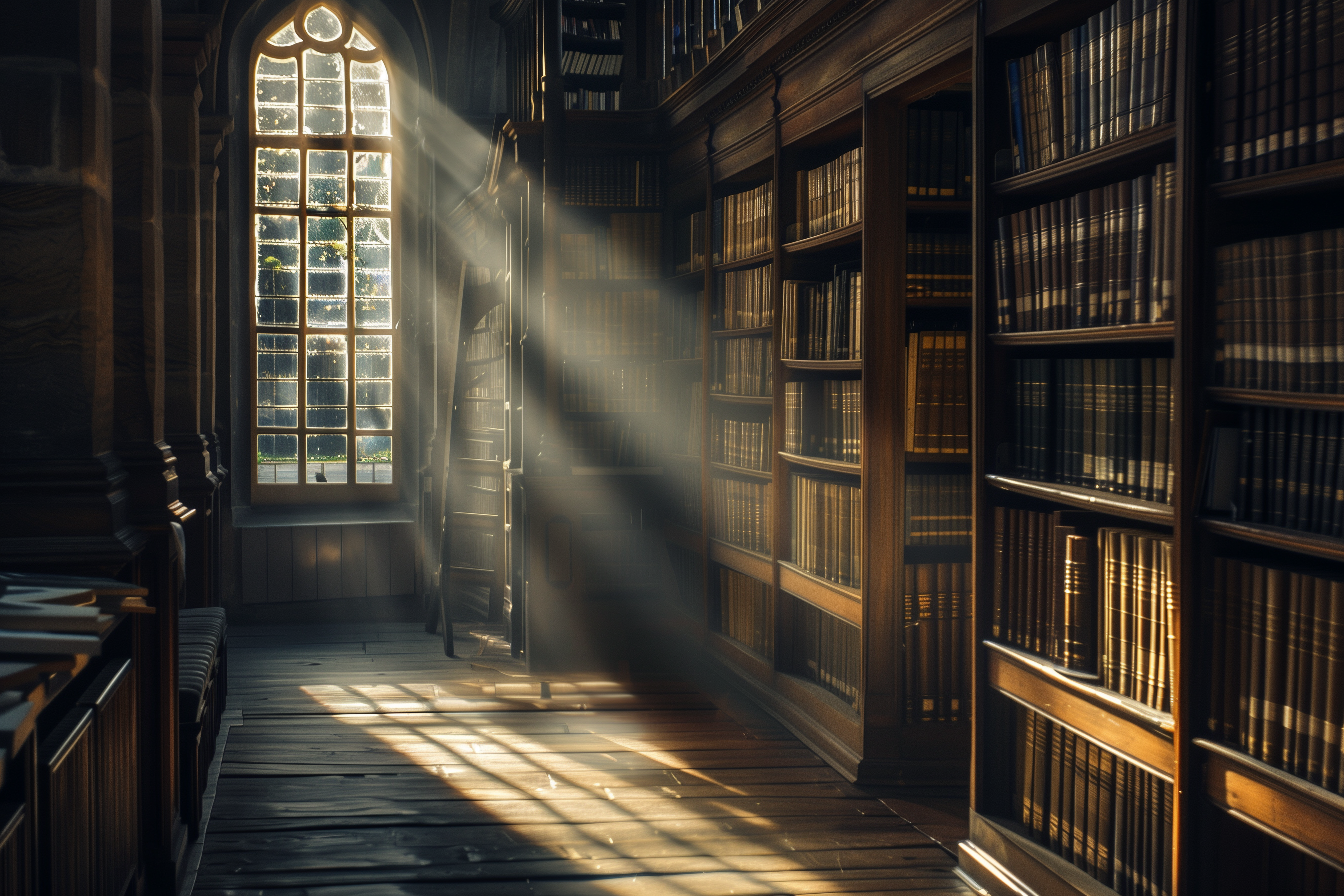 The image captures a vintage English library filled with books on tattoos, showcasing intricate details of spines and covers. A strong interplay of light and shadow adds depth, creating a dramatic and inviting atmosphere.