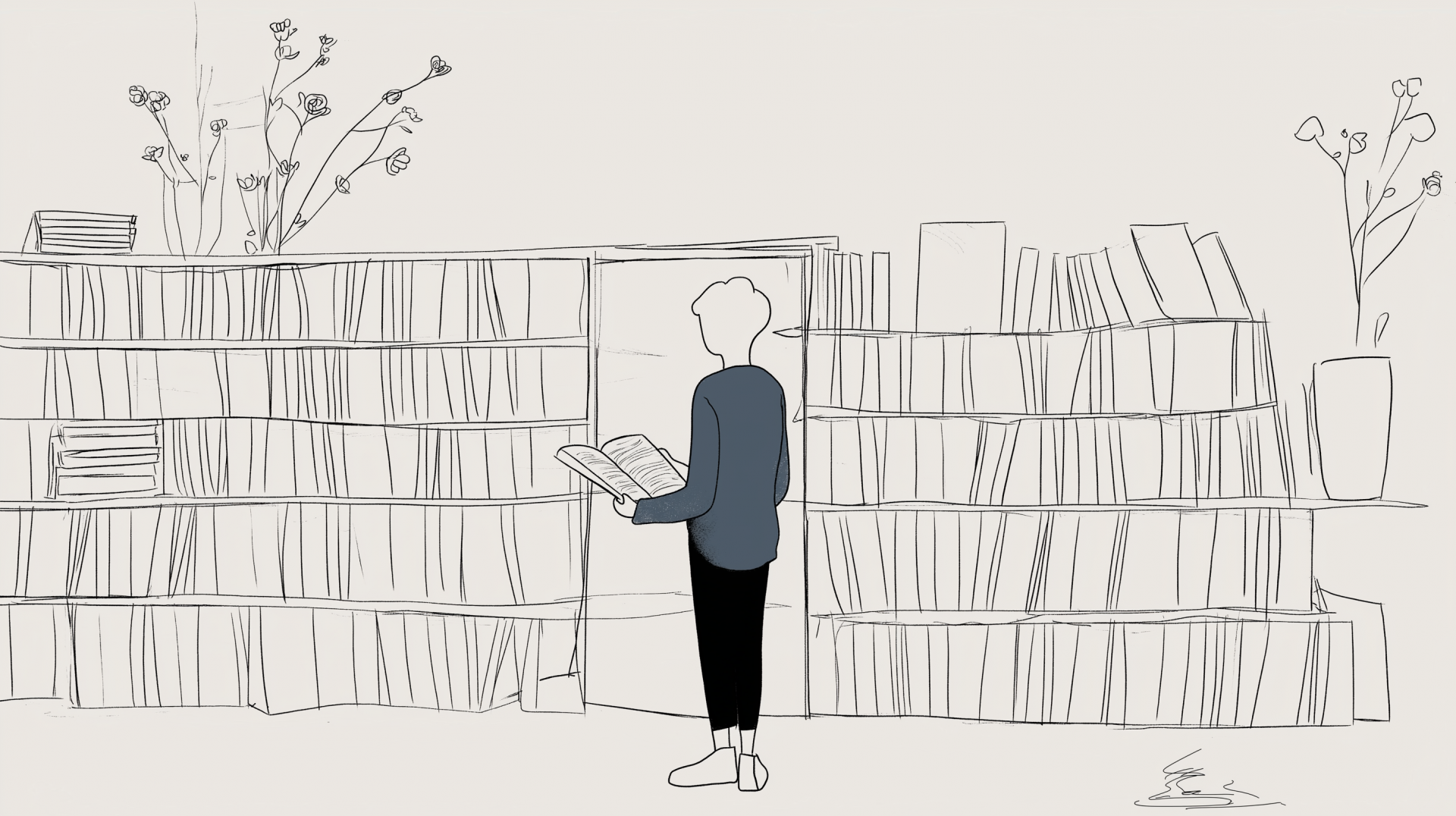 A whimsical stick figure is depicted wandering through a vast library, surrounded by towering shelves filled with books. The cartoon style adds a playful and simplistic feel, highlighting the figure's curiosity as it flips through pages in search of answers about humanity.