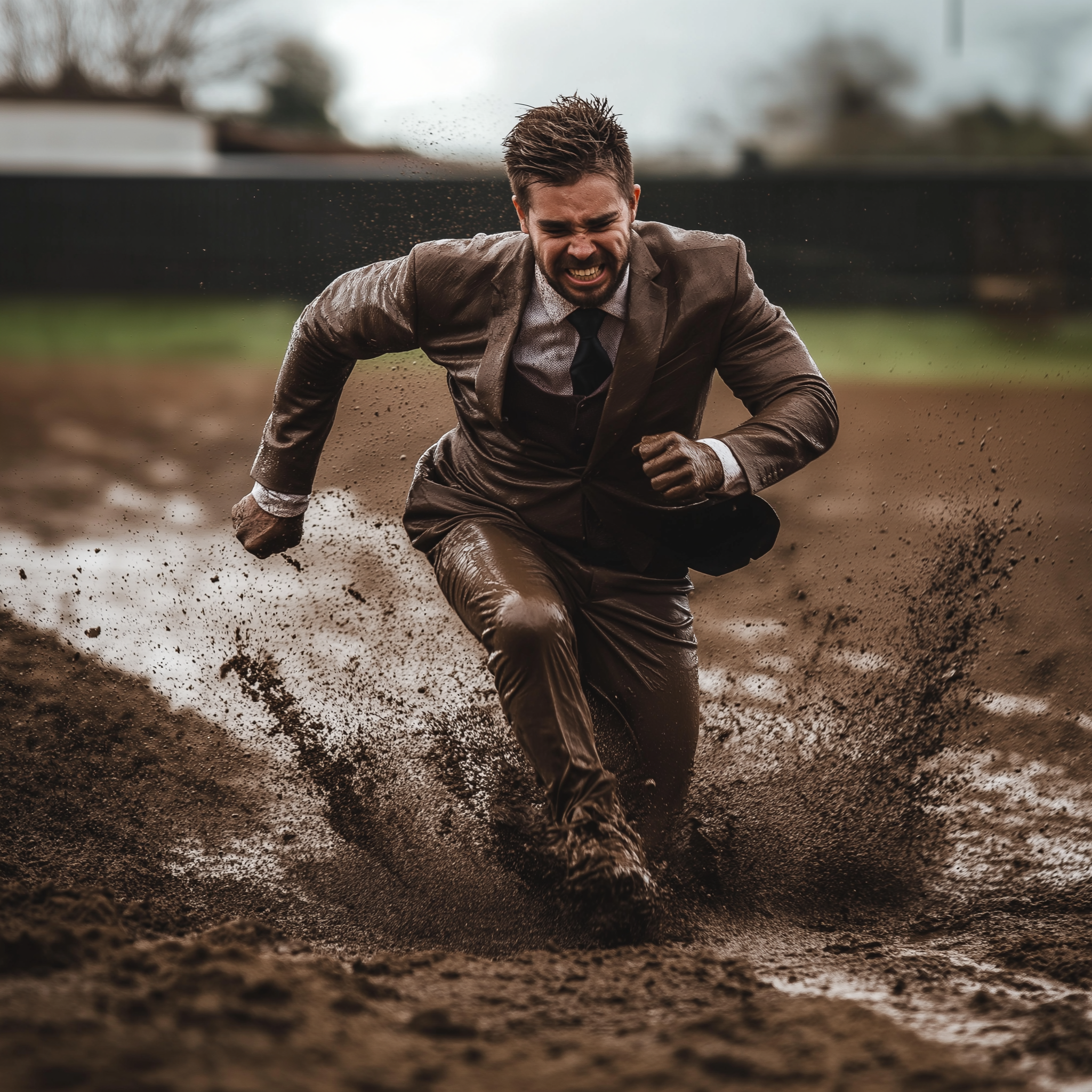 An athletic figure in a business suit navigating through a challenging obstacle course filled with mud, conveying a sense of determination and struggle in a cinematic style.