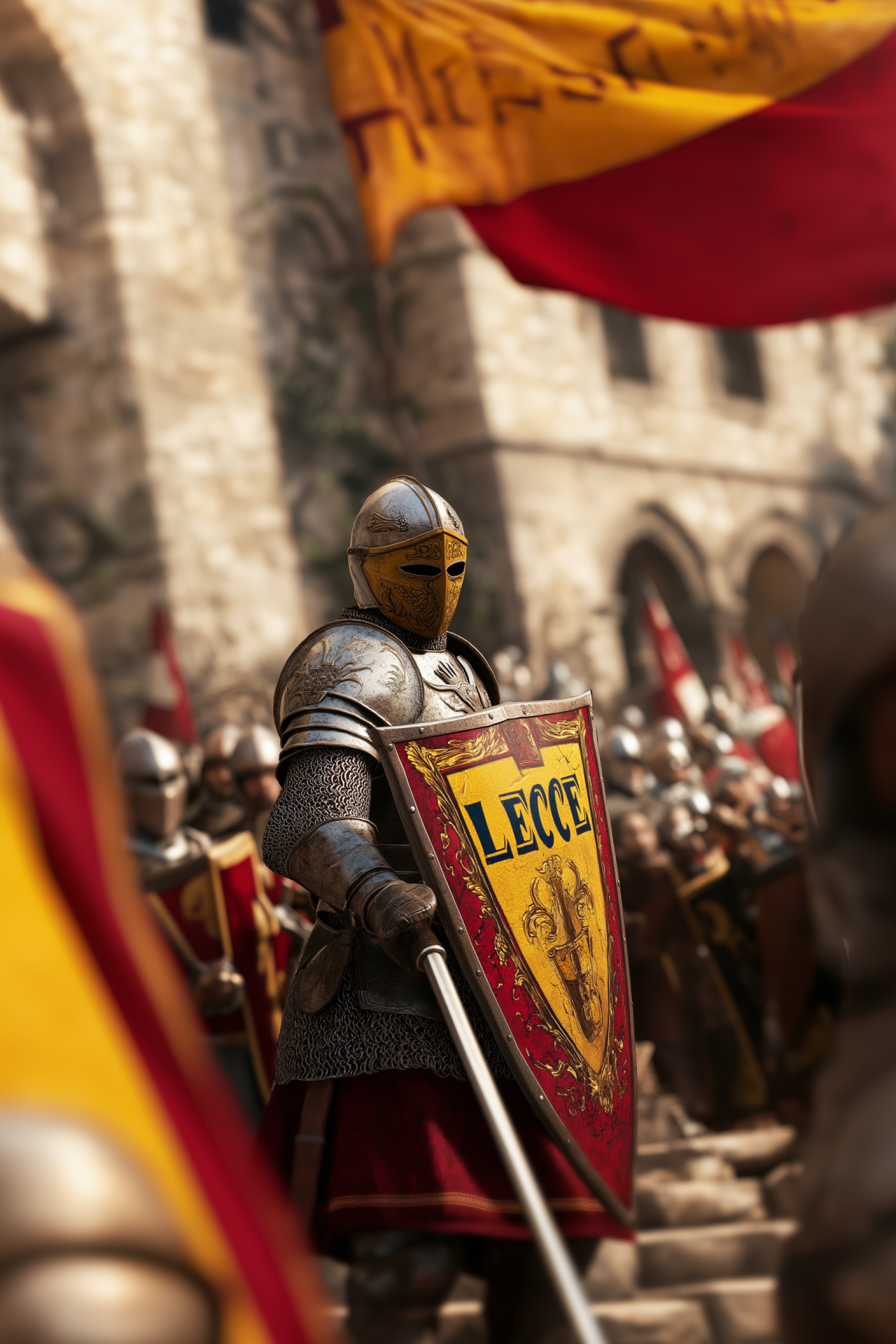The image captures a long shot of a medieval knight clad in striking red and yellow gold armor. The knight stands confidently, displaying a shield adorned with the word 'LECCE', set against a backdrop that evokes a sense of chivalry and adventure.