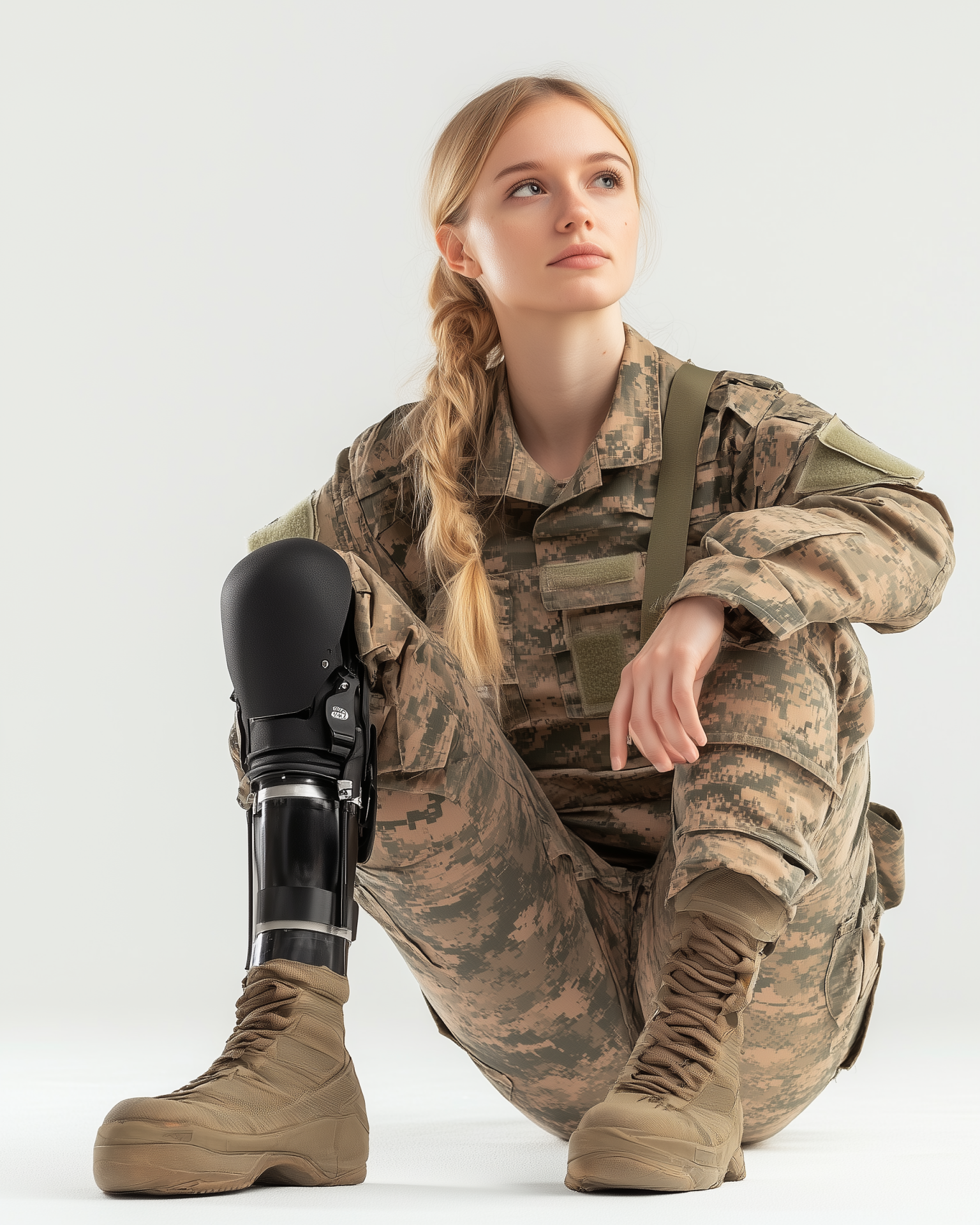 A woman in military uniform sits confidently in a studio against a white background. Her prosthetic leg signifies strength and resilience as she stares straight ahead.